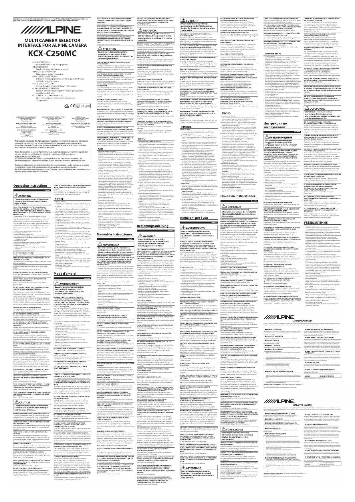 - About Care of DeviceDo not assert any excess pressure to the camera or the mounting, as this could cause the camera direction to shift, or the camera mounting bracket to come off.• To prevent the camera lens, mounting and cords from changing color or shape, or from deteriorating, wipe with a chemical-free, damp cloth.• When washing the car, do not using an automatic car washer, or high-pressure washer. Doing so could cause the camera to come off, damage to the device cord, or may allow water to enter the camera or the inside of the car.• In some cases, to attach the device, a hole must be drilled in the car body, requiring use of touch-up paint (retail product) for rust-prevention, and should be prepared beforehand.• Be sure to disconnect the cable from the (–) battery post before installing your HCE-C125. This will reduce any chance of damage to the unit in case of a short-circuit.• Be sure to connect the color coded leads according to the diagram. Incorrect connections may cause the unit to malfunction or damage to the vehicles electrical system.• When making connections to the vehicles electrical system, be aware of the factory installed components (e.g. on-board computer). Do not tap into these leads to provide power for this unit. When connecting the HCE-C125 to the fuse box, make sure the fuse for the intended circuit of the HCE-C125 has the appropriate amperage. Failure to do so may result in damage to the unit and/or the vehicle. When in doubt, consult your Alpine dealer.• About Rear CameraThe rear camera of this camera system is a dedicated product. Do not connect it to other devices.• About Power ConnectionConnect the reverse input wire (orange/white) to the power cable for the reverse lamp. For more info, contact your Alpine dealer. • Do not use mobile phones and wireless devices near the camera.• Doing so may result in noise on the screen or malfunction. It is recommended to use mobile phones or wireless devices away from the camera.• About Camera Installation LocationBefore installing, make sure there is a enough space to be able to install the camera. If possible, install the camera in the center of the bumper or other fitting. If the camera is installed at a distance left or right of center, the image may differ from the real view.• Confirming the Display FunctionTo connect the unit, confirm that the monitor will require a compatible RCA pin jack. Mode d’emploi Français AVERTISSEMENT Ce symbole désigne des instructions importantes. Le non-respect de ces instructions peut entraîner de graves blessures, voire la mort.LORSQU’IL UTILISE UN SYSTÈME DE CAMÉRA, LE CONDUCTEUR DOIT VÉRIFIER VISUELLEMENT LES CONDITIONS ACTUELLES AUTOUR DU VÉHICULE. IL DOIT S’ASSURER QU’AUCUNE PERSONNE ET QU’AUCUN ANIMAL NE SE TROUVE DANS SON CHAMP DE MANOEUVRE AFIN D’ÉVITER TOUT ACCIDENT.La caméra permet de guider le conducteur par l’envoi d’images à l’écran qui indiquent les conditions à l’arrière du véhicule. La caméra dispose d’un objectif grand-angle. Par conséquent, il existe une différence entre la distance perçue à l’écran et la distance réelle. Par ailleurs, les images affichées par la caméra de recul sont inversées afin qu’elles apparaissent telles que si vous regardiez dans le rétroviseur.Il est possible que la caméra ne fonctionne pas correctement dans les cas suivants:• conditions météorologiques (pluies violentes, neige, brouillard)• températures extrêmement élevées ou basses• angle du véhicule et/ou inclinaison de la chaussée• exposition directe à une source lumineuse intense, notamment aux phares d’un véhicule ou au soleil• passage de lieux très sombres (des parkings ou des tunnels) à des lieux très lumineux, et vice versa• endroits extrêmement sombres• murs ou objets situés en diagonale par rapport à la caméra• rétroviseurs repliés qui modifient l’angle de vision de la caméra• portières et/ou coffre ouverts• changement de hauteur du véhicule dû à la capacité de charge ou aux suspensions hydrauliques• objets situés à l’angle du véhiculeNE PAS DESASSEMBLER NI MODIFIER L’APPAREIL.Il y a risque d’accident, d’incendie ou de choc électrique.GARDER LES PETITS OBJETS COMME LES VIS HORS DE PORTEE DES ENFANTS.L’ingestion de tels objets peut entraîner de graves blessures. En cas d’ingestion, consulter immédiatement un médecin.UTILISER DES FUSIBLES DE L’AMPERAGE APPROPRIE.Il y a risque d’incendie ou de décharge électrique.A UTILISER UNIQUEMENT SUR DES VOITURES A MASSE NEGATIVE DE 12 VOLTS.(Vérifiez auprès de votre concessionnaire si vous n’en êtes pas certain.) Il y a risque d’incendie, etc.AVANT TOUTE CONNEXION, DEBRANCHER LE CABLE DE LA BORNE NEGATIVE DE LA BATTERIE.Il y a risque de choc électrique ou de blessure par courts-circuits.NE PAS UTILISER DES ECROUS NI DES BOULONS DU CIRCUIT DE FREINAGE OU DE DIRECTION POUR LES CONNEXIONS DE MASSE.Les boulons et les écrous utilisés pour les circuits de freinage et de direction (ou de tout autre système de sécurité) ou les réservoirs ne peuvent JAMAIS être utilisés pour l’installation ou la liaison à la masse. L’utilisation de ces organes peut désactiver le système de contrôle du véhicule et causer un incendie, etc.NE PAS ENDOMMAGER DE CONDUITES NI DE CABLES LORS DU FORAGE DES TROUS.Lors du forage de trous dans le châssis en vue de l’installation, veiller à ne pas entrer en contact, endommager ni obstruer de conduites, de tuyaux à carburant ou de fils électriques. Le non-respect de cette précaution peut entraîner un incendie.MINIMISER L’AFFICHAGE EN COURS DE CONDUITE.La visualisation de l’affichage peut distraire le conducteur de la conduite du véhicule et, partant, de provoquer un accident.NE PAS DENUDER LES CABLES ELECTRIQUES. Ne jamais enlever la gaine isolante pour alimenter un autre appareil. Il y a risque de dépassement de la capacité de courant et, par