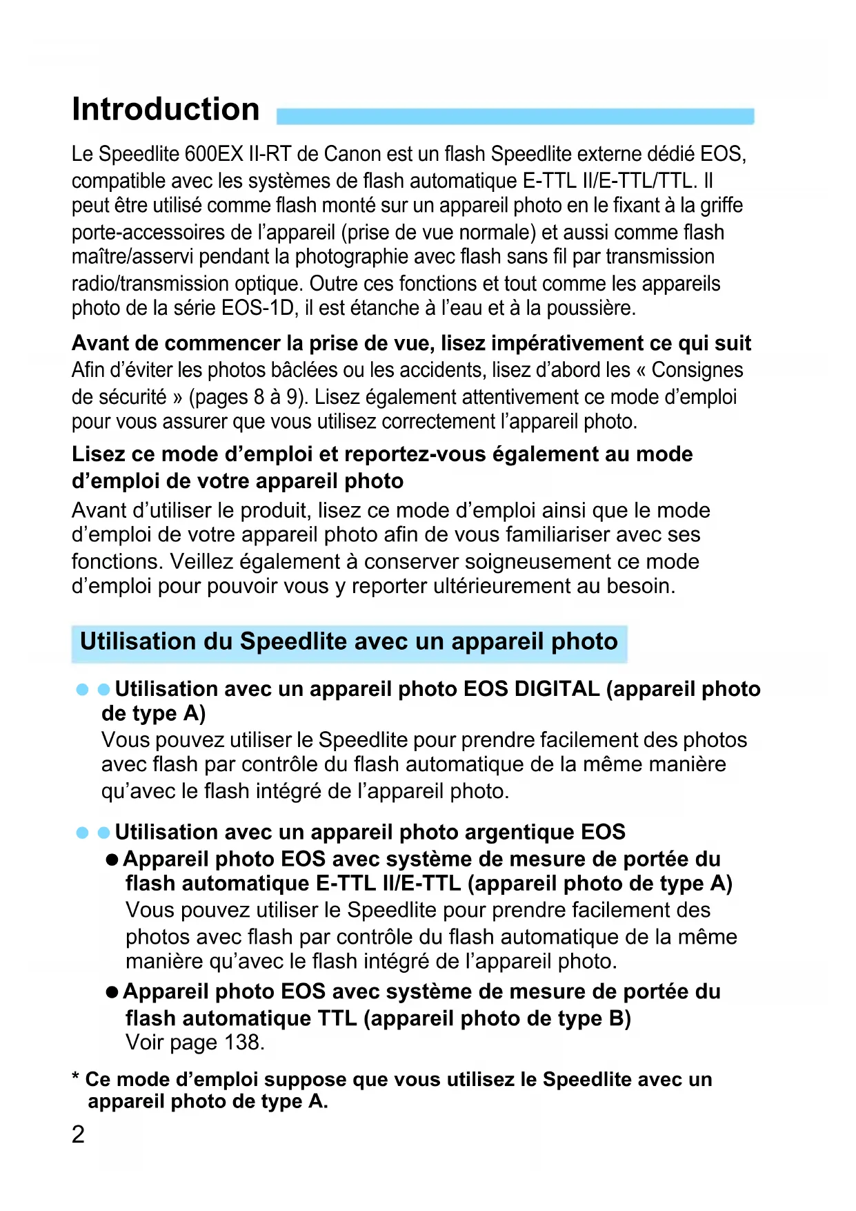 Le Speedlite 600EX II-RT de Canon est un flash Speedlite externe dédié EOS, compatible avec les systèmes de flash automatique E-TTL II/E-TTL/TTL. Il peut être utilisé comme flash monté sur un appareil photo en le fixant à la griffe porte-accessoires de l’appareil (prise de vue normale) et aussi comme flash maître/asservi pendant la photographie avec flash sans fil par transmission radio/transmission optique. Outre ces fonctions et tout comme les appareils photo de la série EOS-1D, il est étanche à l’eau et à la poussière. Avant de commencer la prise de vue, lisez impérativement ce qui suit Afin d’éviter les photos bâclées ou les accidents, lisez d’abord les « Consignes de sécurité » (pages 8 à 9). Lisez également attentivement ce mode d’emploi pour vous assurer que vous utilisez correctement l’appareil photo. Lisez ce mode d’emploi et reportez-vous également au mode d’emploi de votre appareil photo Avant d’utiliser le produit, lisez ce mode d’emploi ainsi que le mode d’emploi de votre appareil photo afin de vous familiariser avec ses fonctions. Veillez également à conserver soigneusement ce mode d’emploi pour pouvoir vous y reporter ultérieurement au besoin. Utilisation avec un appareil photo EOS DIGITAL (appareil photo de type A) Vous pouvez utiliser le Speedlite pour prendre facilement des photos avec flash par contrôle du flash automatique de la même manière qu’avec le flash intégré de l’appareil photo. Utilisation avec un appareil photo argentique EOS Appareil photo EOS avec système de mesure de portée du flash automatique E-TTL II/E-TTL (appareil photo de type A) Vous pouvez utiliser le Speedlite pour prendre facilement des photos avec flash par contrôle du flash automatique de la même manière qu’avec le flash intégré de l’appareil photo. Appareil photo EOS avec système de mesure de portée du flash automatique TTL (appareil photo de type B) Voir page 138.