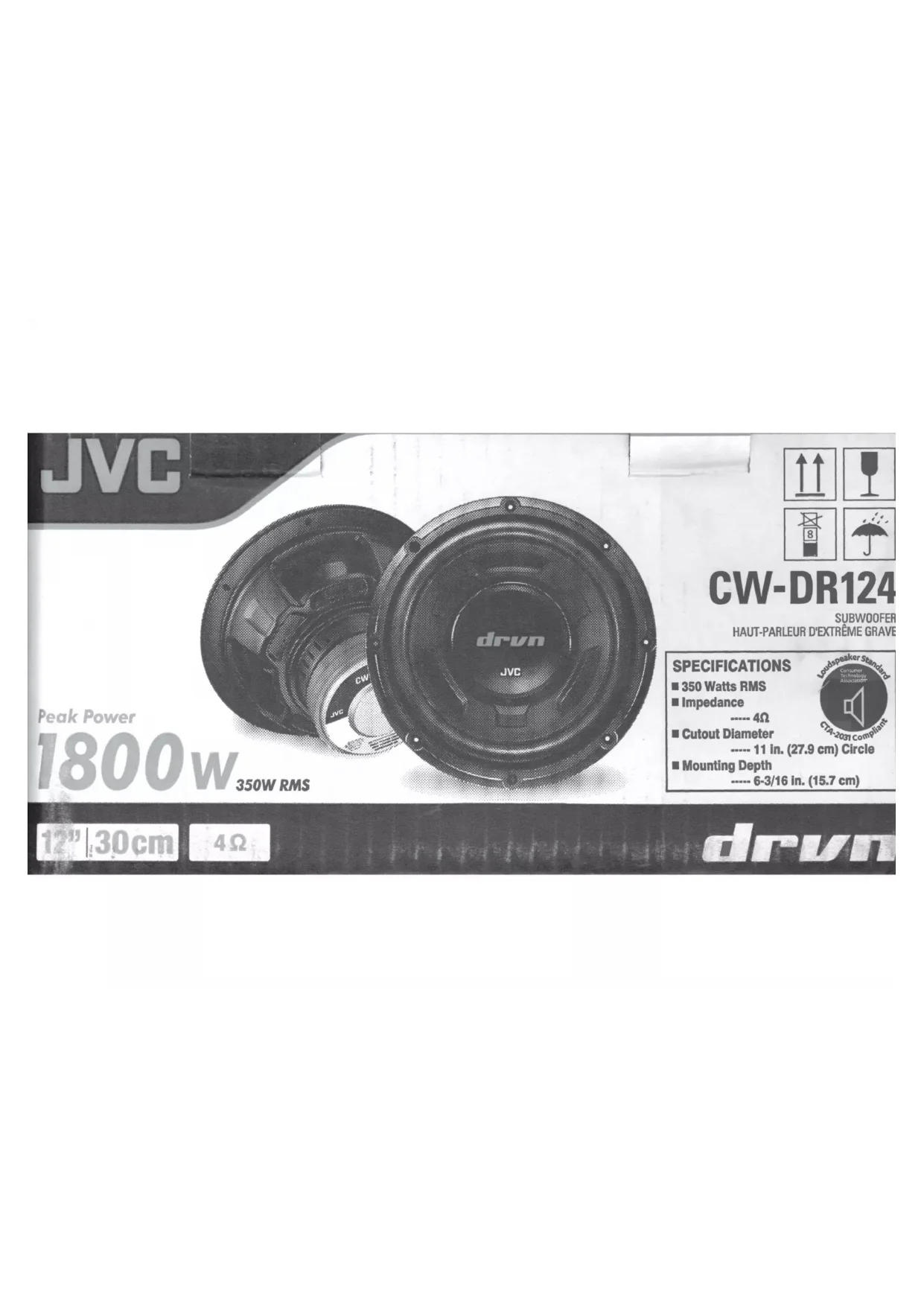 | Caractéristiques techniques | Caisson de basses JVC CWDR124, puissance de 200W, réponse en fréquence de 30Hz à 200Hz, impédance de 4 ohms. |