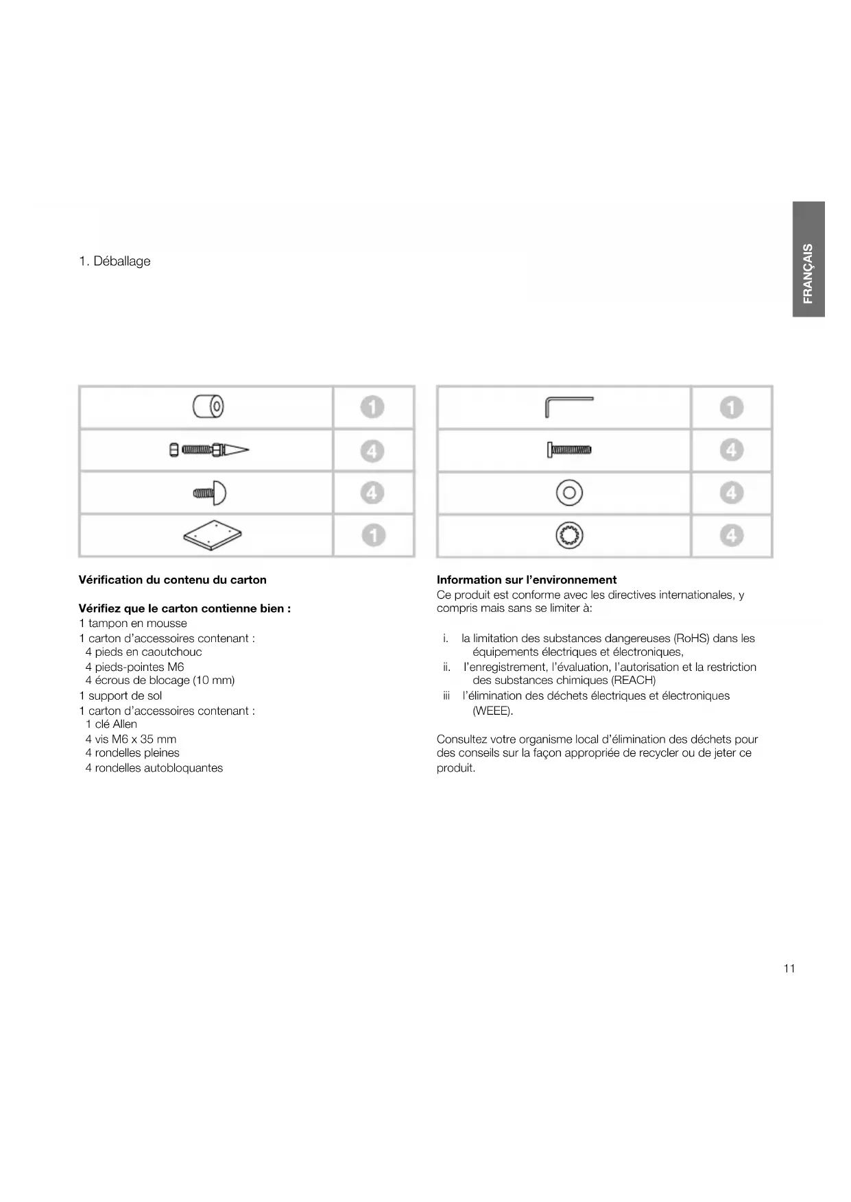 Vérication du contenu du carton Vériez que le carton contienne bien : 1 tampon en mousse 1 carton d’accessoires contenant : 4 pieds en caoutchouc 4 pieds-pointes M6 4 écrous de blocage (10 mm) 1 support de sol 1 carton d’accessoires contenant : 1 clé Allen 4 vis M6 x 35 mm 4 rondelles pleines 4 rondelles autobloquantes Information sur l’environnement Ce produit est conforme avec les directives internationales, y compris mais sans se limiter à: