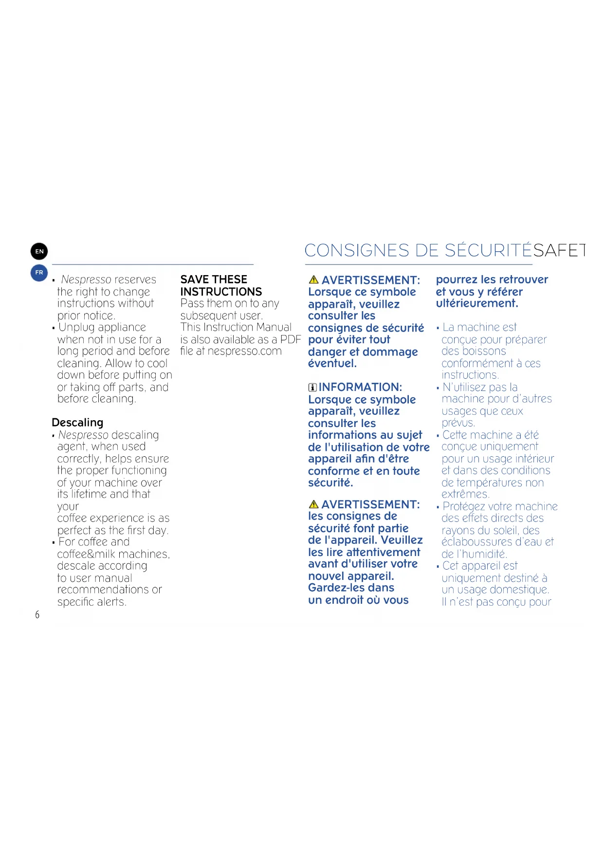 - Pour connaître la marche à suivre pour le détartrage, consulter la section 'Détar trage' de ce livret. CONSERVEZ CES INSTRUCTIONS Transmeez-les à tout nouvel utilisateur de la machine. Ce mode d’emploi est disponible au format PDF sur www.nespresso.com CONSIGNES DE SÉCURITÉMy MachineM600