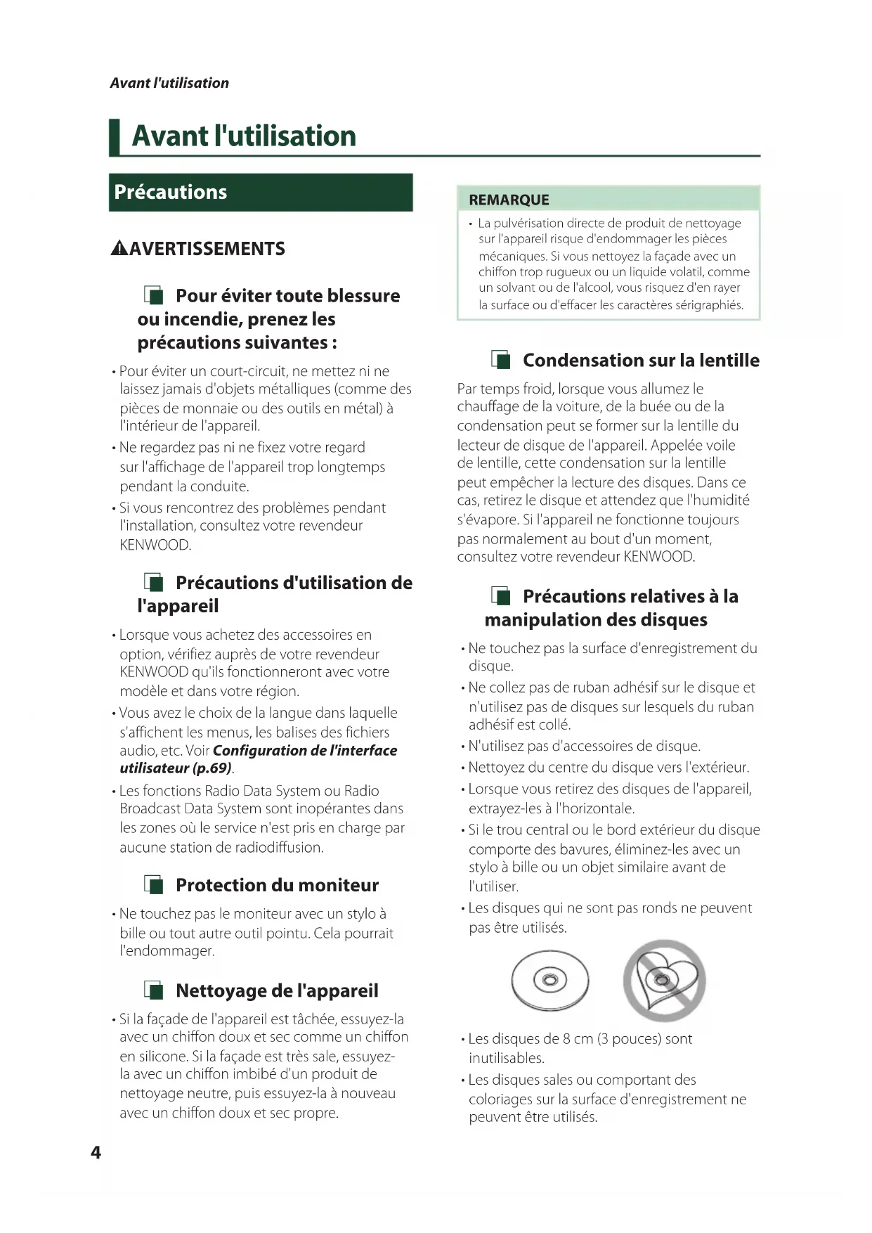 - La pulvérisation directe de produit de nettoyage sur l'appareil risque d'endommager les pièces mécaniques. Si vous nettoyez la façade avec un chiffon trop rugueux ou un liquide volatil, comme un solvant ou de l'alcool, vous risquez d'en rayer la surface ou d'effacer les caractères sérigraphiés. Ñ Condensation sur la lentille Par temps froid, lorsque vous allumez le chauffage de la voiture, de la buée ou de la condensation peut se former sur la lentille du lecteur de disque de l'appareil. Appelée voile de lentille, cette condensation sur la lentille peut empêcher la lecture des disques. Dans ce cas, retirez le disque et attendez que l'humidité s'évapore. Si l'appareil ne fonctionne toujours pas normalement au bout d'un moment, consultez votre revendeur KENWOOD. Ñ Précautions relatives à la manipulation des disques