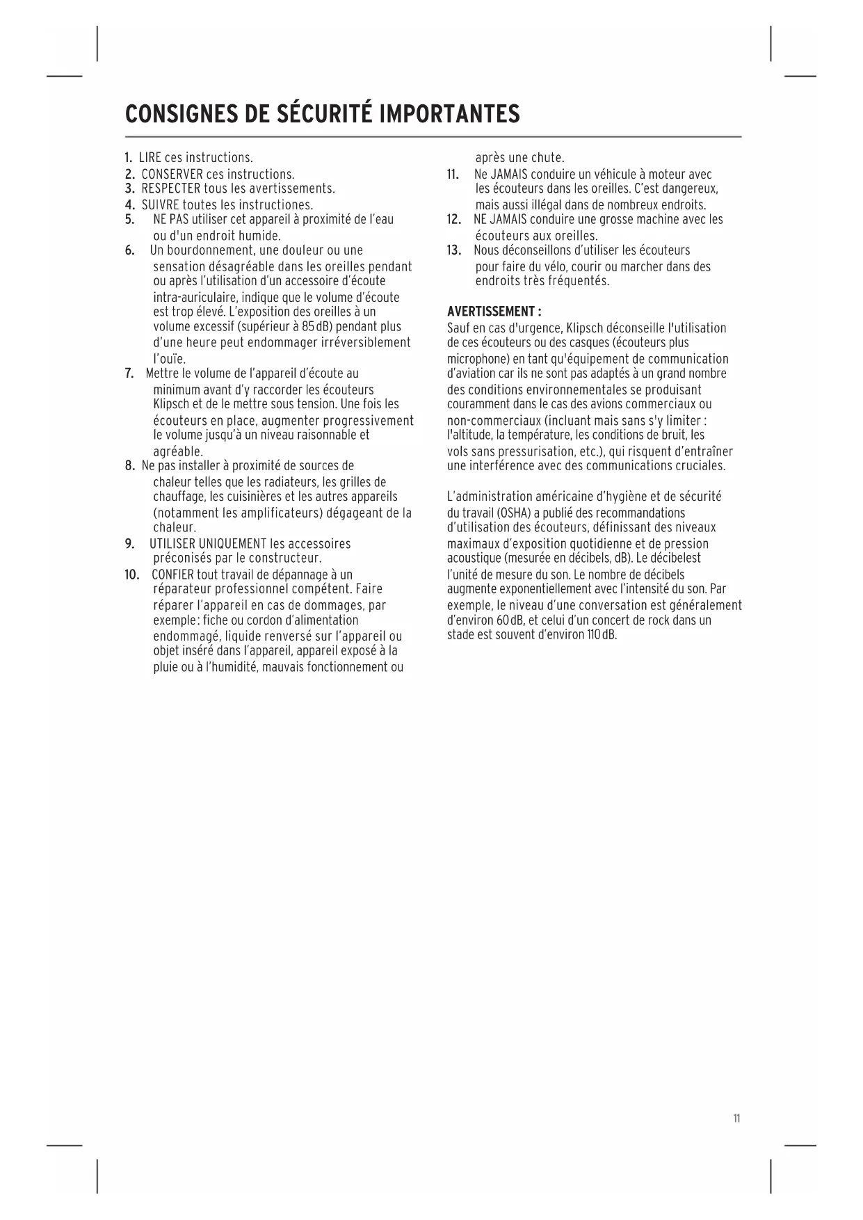 Sauf en cas d'urgence, Klipsch déconseille l'utilisation de ces écouteurs ou des casques (écouteurs plus microphone) en tant qu'équipement de communication d’aviation car ils ne sont pas adaptés à un grand nombre des conditions environnementales se produisant couramment dans le cas des avions commerciaux ou non-commerciaux (incluant mais sans s'y limiter : l'altitude, la température, les conditions de bruit, les vols sans pressurisation, etc.), qui risquent d’entraîner une interférence avec des communications cruciales. L’administration américaine d’hygiène et de sécurité du travail (OSHA) a publié des recommandations d’utilisation des écouteurs, définissant des niveaux maximaux d’exposition quotidienne et de pression acoustique (mesurée en décibels, dB). Le décibelest l’unité de mesure du son. Le nombre de décibels augmente exponentiellement avec l’intensité du son. Par exemple, le niveau d’une conversation est généralement d’environ 60dB, et celui d’un concert de rock dans un stade est souvent d’environ 110dB.12