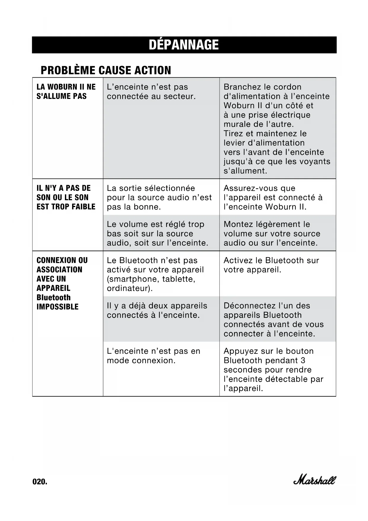 La sortie sélectionnée pour la source audio n’est pas la bonne. Assurez-vous que l'appareil est connecté à l’enceinte Woburn II. Le volume est réglé trop bas soit sur la source audio, soit sur l’enceinte. Montez légèrement le volume sur votre source audio ou sur l’enceinte. CONNEXION OU ASSOCIATION AVEC UN APPAREIL Bluetooth IMPOSSIBLE Le Bluetooth n’est pas activé sur votre appareil (smartphone, tablette, ordinateur). Activez le Bluetooth sur votre appareil. Il y a déjà deux appareils connectés à l'enceinte. Déconnectez l'un des appareils Bluetooth connectés avant de vous connecter à l'enceinte. L'enceinte n’est pas en mode connexion. Appuyez sur le bouton Bluetooth pendant 3 secondes pour rendre l’enceinte détectable par l’appareil. 020.DÉPANNAGE