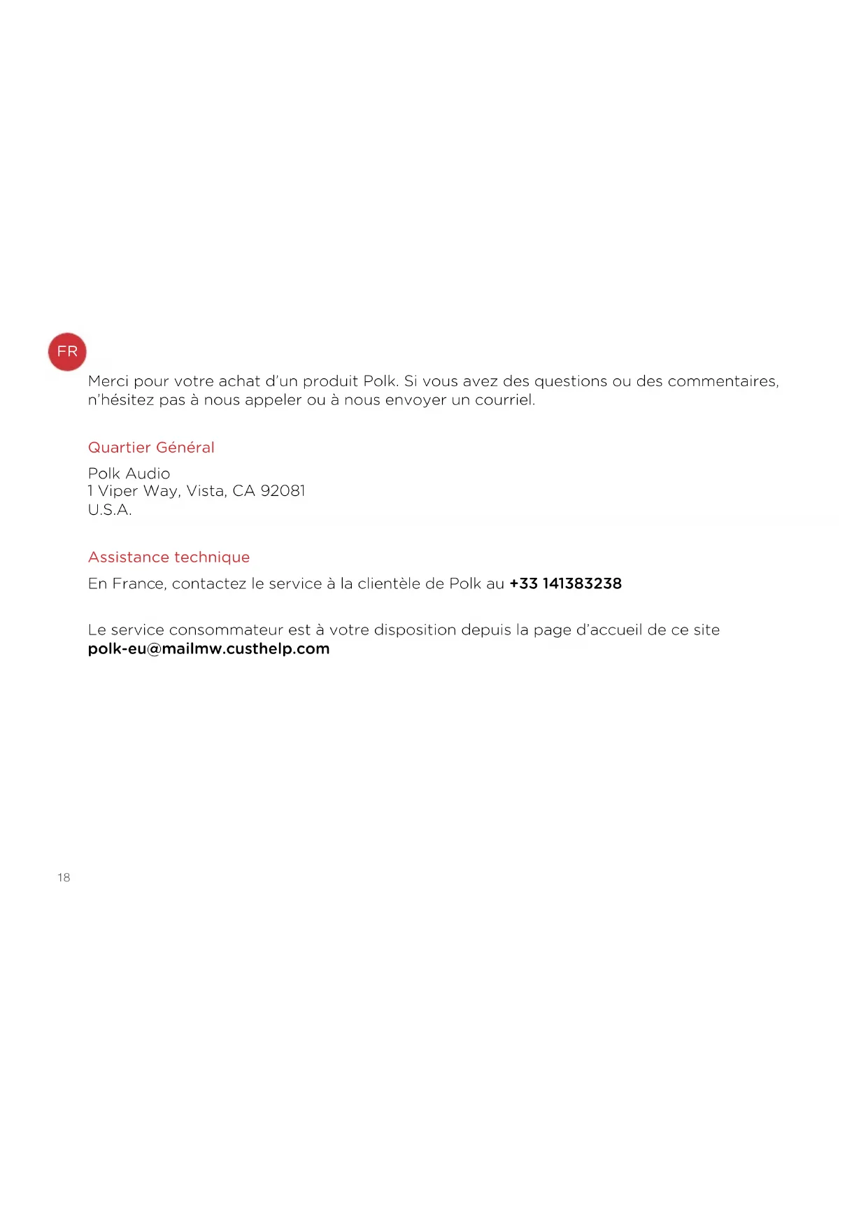 | Maintenance et réparation | Nettoyer avec un chiffon doux, éviter les produits chimiques. En cas de problème, consulter le service client POLK. |