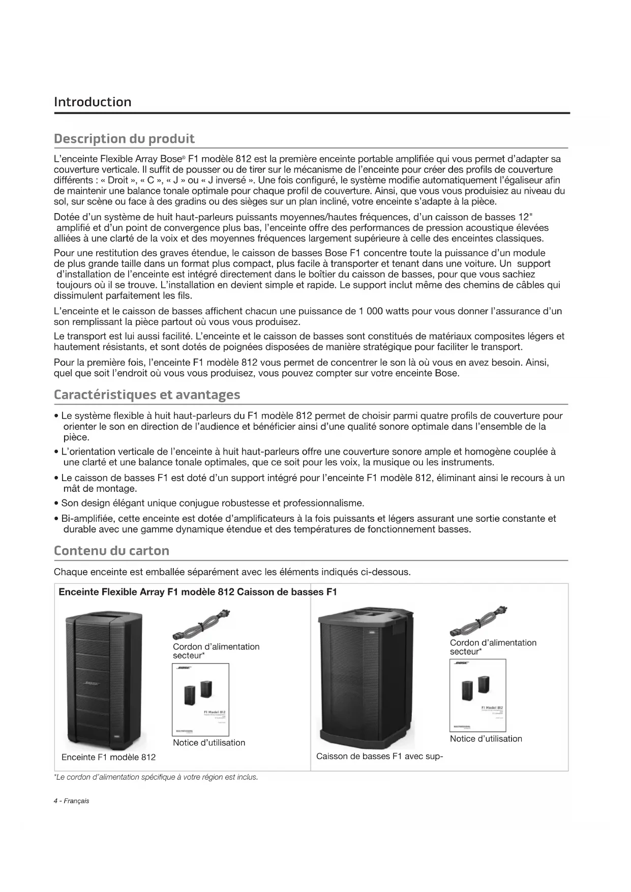 - Bi-amplifiée, cette enceinte est dotée d’amplificateurs à la fois puissants et légers assurant une sortie constante et durable avec une gamme dynamique étendue et des températures de fonctionnement basses. Contenu du carton Chaque enceinte est emballée séparément avec les éléments indiqués ci-dessous. Enceinte Flexible Array F1 modèle 812 Caisson de basses F1 Cordon d’alimentation secteur* Notice d’utilisation Enceinte F1 modèle 812 Cordon d’alimentation secteur* Notice d’utilisation Caisson de basses F1 avec sup- *Le cordon d’alimentation spécifique à votre région est inclus.Français - 5 Introduction Enceinte Flexible Array F1 modèle812 Remarque : l’enceinte F1 modèle 812 est équipée d’inserts M8 pour sa suspension ou la fixation de supports pour accessoires. ATTENTION : seul un installateur professionnel connaissant les accessoires et techniques de montage adaptés est qualifié pour installer des enceintes suspendues. HAUT