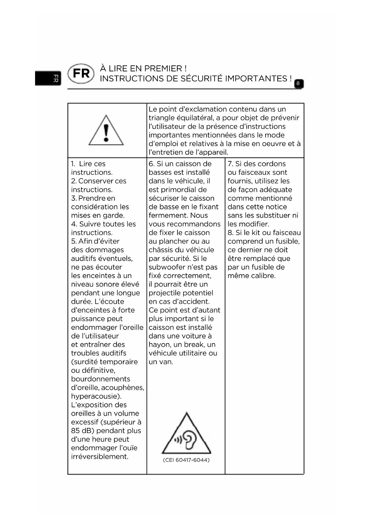 Subwoofer 8" (200mm) 10" (250mm) Cone Flax Flax Voice coil diameter 1 1/2 " (38mm) 1 1/2 " (38mm) Surround Rubber Rubber Max. power 400W 560W Nom. power 200W RMS 280W RMS Sensitivity (2.83V/1m) 86dB 87dB Impedance 4Ω 4ΩÀ LIRE EN PREMIER ! INSTRUCTIONS DE SÉCURITÉ IMPORTANTES ! Le point d’exclamation contenu dans un triangle équilatéral, a pour objet de prévenir l’utilisateur de la présence d’instructions importantes mentionnées dans le mode d’emploi et relatives à la mise en oeuvre et à l’entretien de l’appareil.
