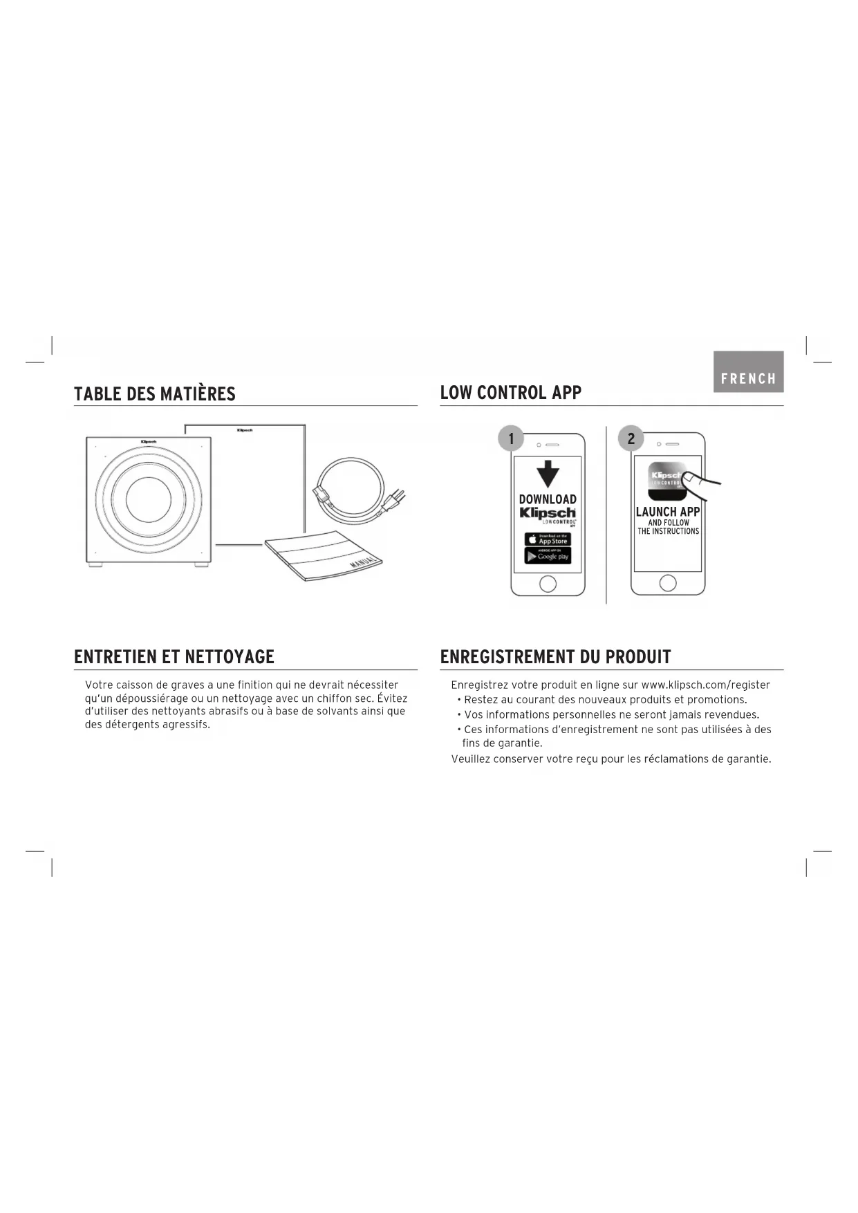 Enregistrez votre produit en ligne sur www.klipsch.com/register• Restez au courant des nouveaux produits et promotions.• Vos informations personnelles ne seront jamais revendues.• Ces informations d’enregistrement ne sont pas utilisées à des fins de garantie. Veuillez conserver votre reçu pour les réclamations de garantie.