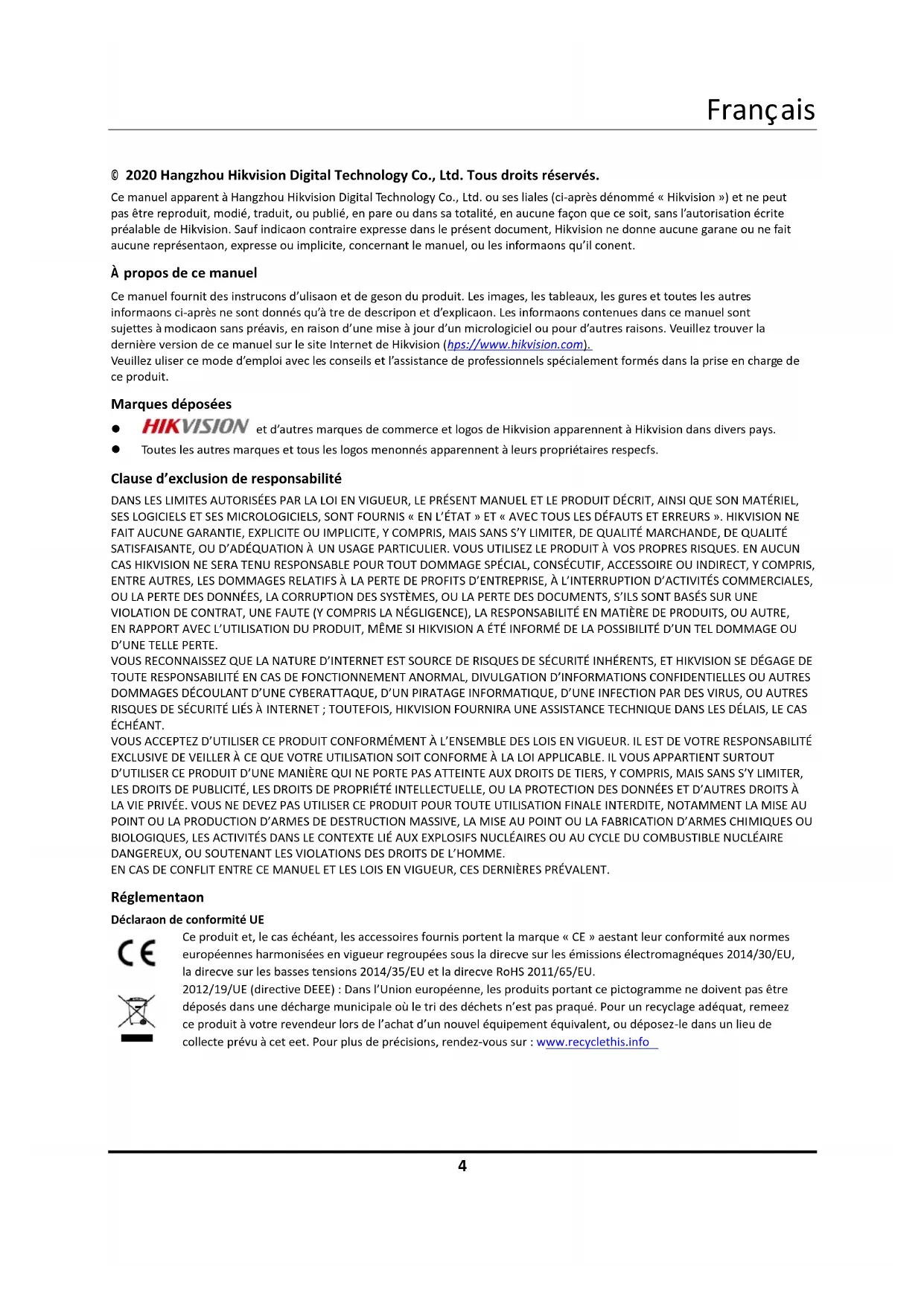 © 2020 Hangzhou Hikvision Digital Technology Co., Ltd. Tous droits réservés. Ce manuel appartient à Hangzhou Hikvision Digital Technology Co., Ltd. ou ses filiales (ci-après dénommé « Hikvision ») et ne peut pas être reproduit, modifié, traduit, ou publié, en partie ou dans sa totalité, en aucune façon que ce soit, sans l’autorisation écrite préalable de Hikvision. Sauf indication contraire expresse dans le présent document, Hikvision ne donne aucune garantie ou ne fait aucune représentation, expresse ou implicite, concernant le manuel, ou les informations qu’il contient. À propos de ce manuel Ce manuel fournit des instructions d’utilisation et de gestion du produit. Les images, les tableaux, les figures et toutes les autres informations ci-après ne sont donnés qu’à titre de description et d’explication. Les informations contenues dans ce manuel sont sujettes à modification sans préavis, en raison d’une mise à jour d’un micrologiciel ou pour d’autres raisons. Veuillez trouver la dernière version de ce manuel sur le site Internet de Hikvision (https://www.hikvision.com). Veuillez utiliser ce mode d’emploi avec les conseils et l’assistance de professionnels spécialement formés dans la prise en charge de ce produit. Marques déposées et d’autres marques de commerce et logos de Hikvision appartiennent à Hikvision dans divers pays. Toutes les autres marques et tous les logos mentionnés appartiennent à leurs propriétaires respectifs. Clause d’exclusion de responsabilité DANS LES LIMITES AUTORISÉES PAR LA LOI EN VIGUEUR, LE PRÉSENT MANUEL ET LE PRODUIT DÉCRIT, AINSI QUE SON MATÉRIEL, SES LOGICIELS ET SES MICROLOGICIELS, SONT FOURNIS « EN L’ÉTAT » ET « AVEC TOUS LES DÉFAUTS ET ERREURS ». HIKVISION NE FAIT AUCUNE GARANTIE, EXPLICITE OU IMPLICITE, Y COMPRIS, MAIS SANS S’Y LIMITER, DE QUALITÉ MARCHANDE, DE QUALITÉ SATISFAISANTE, OU D’ADÉQUATION À UN USAGE PARTICULIER. VOUS UTILISEZ LE PRODUIT À VOS PROPRES RISQUES. EN AUCUN CAS HIKVISION NE SERA TENU RESPONSABLE POUR TOUT DOMMAGE SPÉCIAL, CONSÉCUTIF, ACCESSOIRE OU INDIRECT, Y COMPRIS, ENTRE AUTRES, LES DOMMAGES RELATIFS À LA PERTE DE PROFITS D’ENTREPRISE, À L’INTERRUPTION D’ACTIVITÉS COMMERCIALES, OU LA PERTE DES DONNÉES, LA CORRUPTION DES SYSTÈMES, OU LA PERTE DES DOCUMENTS, S’ILS SONT BASÉS SUR UNE VIOLATION DE CONTRAT, UNE FAUTE (Y COMPRIS LA NÉGLIGENCE), LA RESPONSABILITÉ EN MATIÈRE DE PRODUITS, OU AUTRE, EN RAPPORT AVEC L’UTILISATION DU PRODUIT, MÊME SI HIKVISION A ÉTÉ INFORMÉ DE LA POSSIBILITÉ D’UN TEL DOMMAGE OU D’UNE TELLE PERTE. VOUS RECONNAISSEZ QUE LA NATURE D’INTERNET EST SOURCE DE RISQUES DE SÉCURITÉ INHÉRENTS, ET HIKVISION SE DÉGAGE DE TOUTE RESPONSABILITÉ EN CAS DE FONCTIONNEMENT ANORMAL, DIVULGATION D’INFORMATIONS CONFIDENTIELLES OU AUTRES DOMMAGES DÉCOULANT D’UNE CYBERATTAQUE, D’UN PIRATAGE INFORMATIQUE, D’UNE INFECTION PAR DES VIRUS, OU AUTRES RISQUES DE SÉCURITÉ LIÉS À INTERNET ; TOUTEFOIS, HIKVISION FOURNIRA UNE ASSISTANCE TECHNIQUE DANS LES DÉLAIS, LE CAS ÉCHÉANT. VOUS ACCEPTEZ D’UTILISER CE PRODUIT CONFORMÉMENT À L’ENSEMBLE DES LOIS EN VIGUEUR. IL EST DE VOTRE RESPONSABILITÉ EXCLUSIVE DE VEILLER À CE QUE VOTRE UTILISATION SOIT CONFORME À LA LOI APPLICABLE. IL VOUS APPARTIENT SURTOUT D’UTILISER CE PRODUIT D’UNE MANIÈRE QUI NE PORTE PAS ATTEINTE AUX DROITS DE TIERS, Y COMPRIS, MAIS SANS S’Y LIMITER, LES DROITS DE PUBLICITÉ, LES DROITS DE PROPRIÉTÉ INTELLECTUELLE, OU LA PROTECTION DES DONNÉES ET D’AUTRES DROITS À LA VIE PRIVÉE. VOUS NE DEVEZ PAS UTILISER CE PRODUIT POUR TOUTE UTILISATION FINALE INTERDITE, NOTAMMENT LA MISE AU POINT OU LA PRODUCTION D’ARMES DE DESTRUCTION MASSIVE, LA MISE AU POINT OU LA FABRICATION D’ARMES CHIMIQUES OU BIOLOGIQUES, LES ACTIVITÉS DANS LE CONTEXTE LIÉ AUX EXPLOSIFS NUCLÉAIRES OU AU CYCLE DU COMBUSTIBLE NUCLÉAIRE DANGEREUX, OU SOUTENANT LES VIOLATIONS DES DROITS DE L’HOMME. EN CAS DE CONFLIT ENTRE CE MANUEL ET LES LOIS EN VIGUEUR, CES DERNIÈRES PRÉVALENT. Réglementation Déclaration de conformité UE