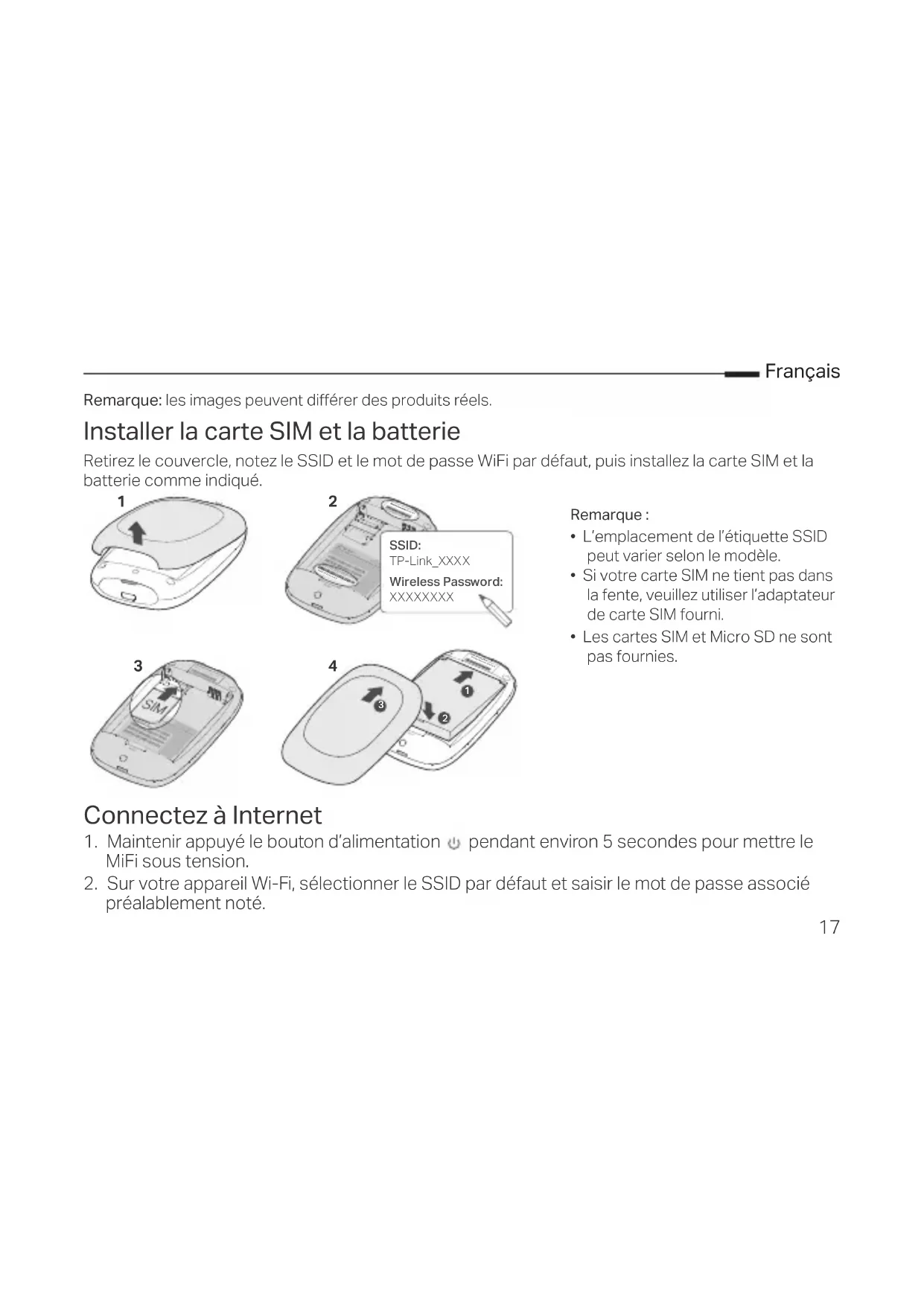 préalablement noté. Remarque :• L’emplacement de l’étiquette SSID peut varier selon le modèle.• Si votre carte SIM ne tient pas dans la fente, veuillez utiliser l’adaptateur de carte SIM fourni.• Les cartes SIM et Micro SD ne sont pas fournies.