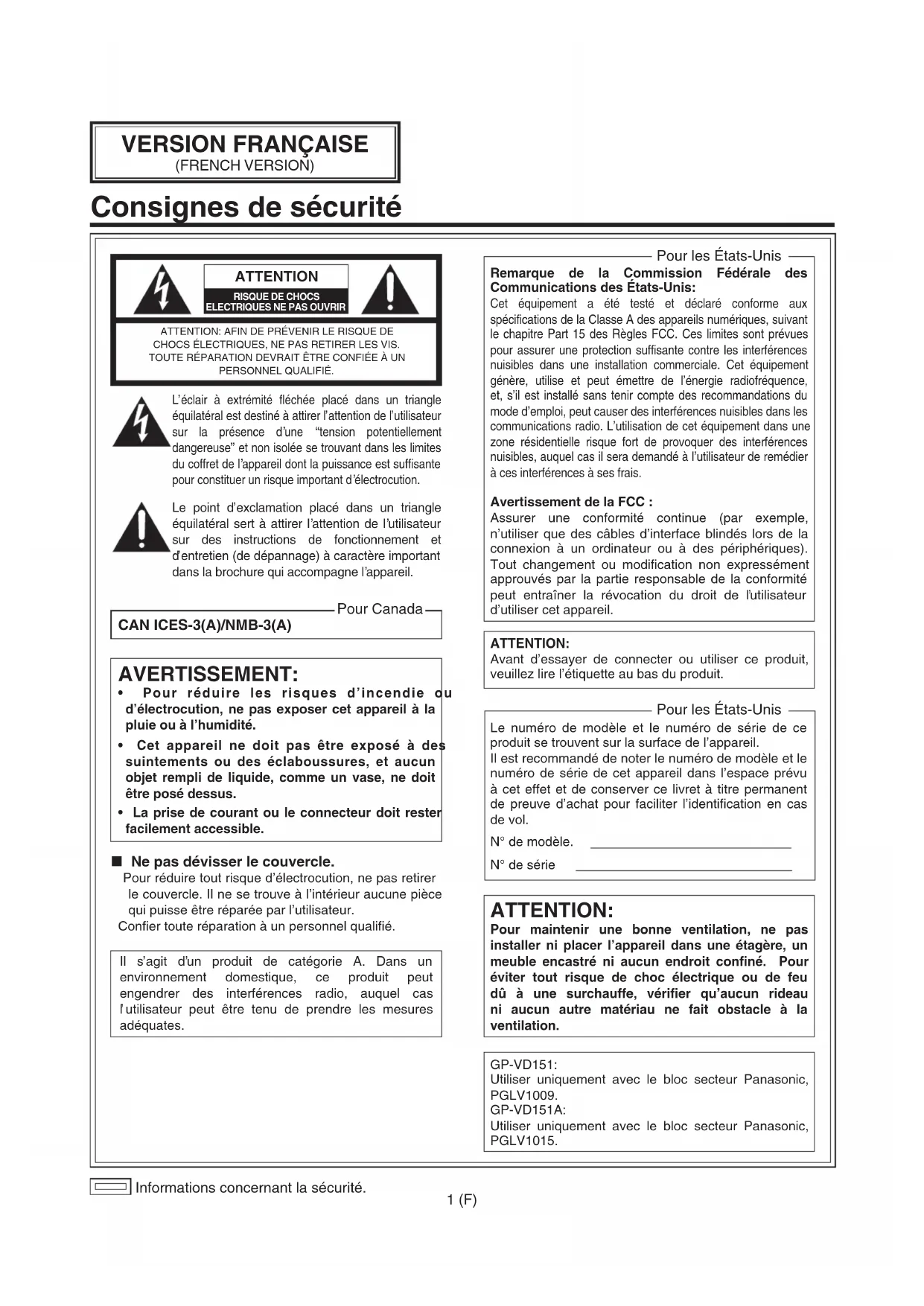 utilisateur d’utiliser cet appareil. ATTENTION: Pour maintenir une bonne ventilation, ne pas installer ni placer l’appareil dans une étagère, un meuble encastré ni aucun endroit confiné. Pour éviter tout risque de choc électrique ou de feu dû à une surchauffe, vérifier qu’aucun rideau ni aucun autre matériau ne fait obstacle à la ventilation. Pour les États-Unis ATTENTION: Avant d’essayer de connecter ou utiliser ce produit, veuillez lire l’étiquette au bas du produit. Le numéro de modèle et le numéro de série de ce produit se trouvent sur la surface de l’appareil. Il est recommandé de noter le numéro de modèle et le numéro de série de cet appareil dans l’espace prévu à cet effet et de conserver ce livret à titre permanent de preuve d’achat pour faciliter l’identification en cas de vol. N° de modèle. N° de série Pour les États-Unis GP-VD151: Utiliser uniquement avec le bloc secteur Panasonic, PGLV1009. GP-VD151A: Utiliser uniquement avec le bloc secteur Panasonic, PGLV1015. Ne pas dévisser le couvercle. Pour réduire tout risque d’électrocution, ne pas retirer le couvercle. Il ne se trouve à l’intérieur aucune pièce qui puisse être réparée par l’utilisateur. Confier toute réparation à un personnel qualifié. Il s