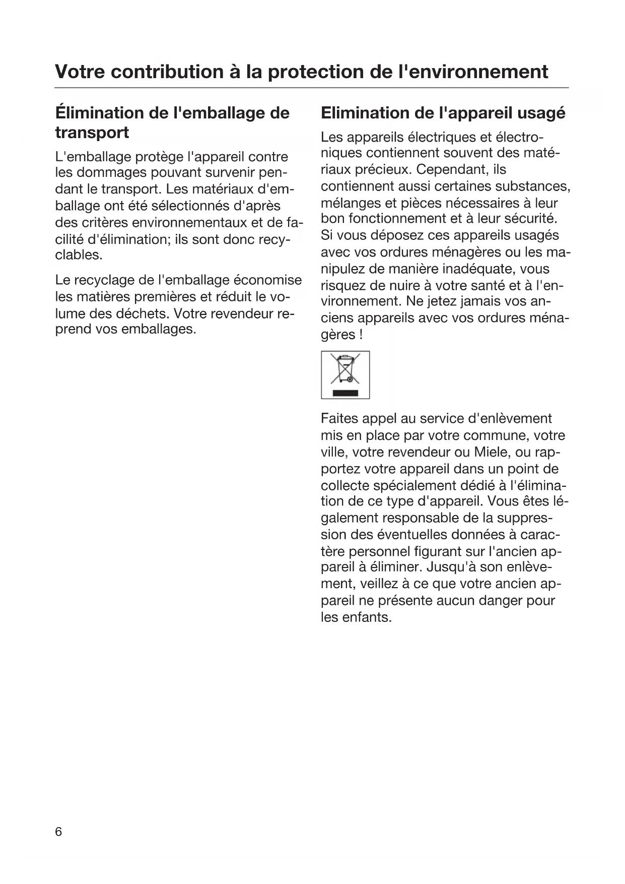 Élimination de l'emballage de transport L'emballage protège l'appareil contre les dommages pouvant survenir pen- dant le transport. Les matériaux d'em- ballage ont été sélectionnés d'après des critères environnementaux et de fa- cilité d'élimination; ils sont donc recy- clables. Le recyclage de l'emballage économise les matières premières et réduit le vo- lume des déchets. Votre revendeur re- prend vos emballages. Elimination de l'appareil usagé Les appareils électriques et électro- niques contiennent souvent des maté- riaux précieux. Cependant, ils contiennent aussi certaines substances, mélanges et pièces nécessaires à leur bon fonctionnement et à leur sécurité. Si vous déposez ces appareils usagés avec vos ordures ménagères ou les ma- nipulez de manière inadéquate, vous risquez de nuire à votre santé et à l'en- vironnement. Ne jetez jamais vos an- ciens appareils avec vos ordures ména- gères! Faites appel au service d'enlèvement mis en place par votre commune, votre ville, votre revendeur ou Miele, ou rap- portez votre appareil dans un point de collecte spécialement dédié à l'élimina- tion de ce type d'appareil. Vous êtes lé- galement responsable de la suppres- sion des éventuelles données à carac- tère personnel figurant sur l'ancien ap- pareil à éliminer. Jusqu'à son enlève- ment, veillez à ce que votre ancien ap- pareil ne présente aucun danger pour les enfants.Prescriptions de sécurité et mises en garde