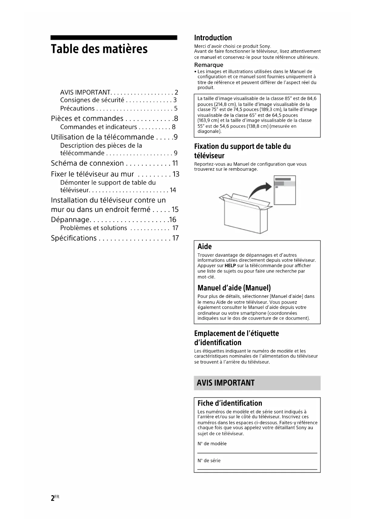- Spécifications Introduction Merci d’avoir choisi ce produit Sony.Avant de faire fonctionner le téléviseur, lisez attentivement ce manuel et conservez-le pour toute référence ultérieure.Remarque• Les images et illustrations utilisées dans le Manuel de configuration et ce manuel sont fournies uniquement à titre de référence et peuvent différer de l’aspect réel du produit. Fixation du support de table du téléviseur Reportez-vous au Manuel de configuration que vous trouverez sur le rembourrage. Emplacement de l’étiquette d’identification Les étiquettes indiquant le numéro de modèle et les caractéristiques nominales de l’alimentation du téléviseur se trouvent à l’arrière du téléviseur. AVIS IMPORTANT La taille d’image visualisable de la classe 85” est de 84,6 pouces (214,8 cm), la taille d’image visualisable de la classe 75” est de 74,5 pouces (189,3 cm), la taille d’image visualisable de la classe 65” est de 64,5 pouces (163,9 cm) et la taille d’image visualisable de la classe 55” est de 54,6 pouces (138,8 cm) (mesurée en diagonale) p. 17