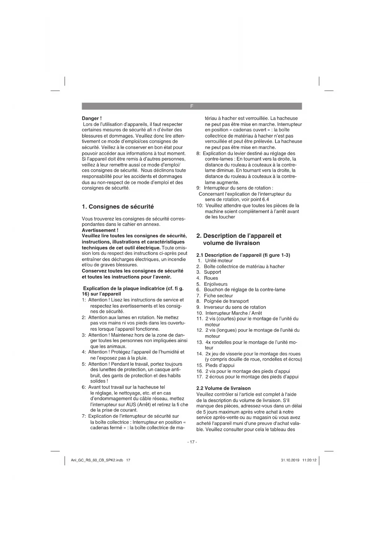 Dérangement Cause probable Élimination Moteur ne démarre pas - Interruption de courant - Le disjoncteur-protecteur s’est déc- lenché - L’interrupteur de sécurité ne donne aucun contact - L’inverseur du sens de rotation est en position centrale - Contrôlez le câble réseau, la fi che et le coupe-circuit - Appuyez sur la touche RAZ (voir repère 6.5) - Placez la boîte collectrice correc- tement et poussez l’interrupteur de sécurité vers le haut jusqu’à ce qu’il s’encrante - Réglez le sens du mouvement sur l’inverseur du sens de rotation Le matériau à ha- cher ne s’engage pas. - La lame du broyeur fonctionne en arrière - Bourrage de matériau dans l’entonnoir de remplissage - La lame du broyeur est bloquée - Commutez le sens de rotation - Commutez le sens de rotation et tirez le matériau de l’entonnoir de remplissage. Réintroduisez des branches épaisses pour que le cou- teau ne s’engage pas tout de suite dans l’encoche précoupée. - Commutez le sens de rotation. Le couteau libère le matériel coin- cé. Le matériau à ha- cher n’est pas ha- ché correctement - Contre-lame mal réglée - Réglez la contre-lame. Cf. à ce pro- pos le chapitre 6.8 Anl_GC_RS_60_CB_SPK2.indb 23Anl_GC_RS_60_CB_SPK2.indb 23 31.10.2019 11:20:1331.10.2019 11:20:13F