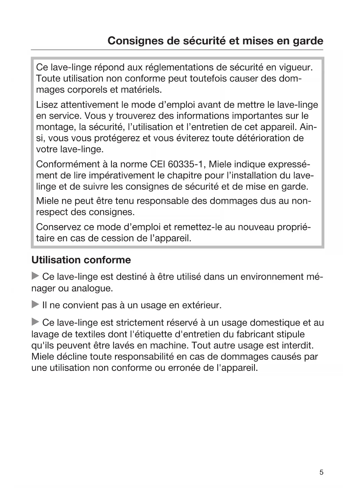 Ce lave-linge répond aux réglementations de sécurité en vigueur. Toute utilisation non conforme peut toutefois causer des dom- mages corporels et matériels. Lisez attentivement le mode d’emploi avant de mettre le lave-linge en service. Vous y trouverez des informations importantes sur le montage, la sécurité, l’utilisation et l’entretien de cet appareil. Ain- si, vous vous protégerez et vous éviterez toute détérioration de votre lave-linge. Conformément à la norme CEI60335-1, Miele indique expressé- ment de lire impérativement le chapitre pour l’installation du lave- linge et de suivre les consignes de sécurité et de mise en garde. Miele ne peut être tenu responsable des dommages dus au non- respect des consignes. Conservez ce mode d’emploi et remettez-le au nouveau proprié- taire en cas de cession de l’appareil. Utilisation conforme Ce lave-linge est destiné à être utilisé dans un environnement mé- nager ou analogue. Il ne convient pas à un usage en extérieur. Ce lave-linge est strictement réservé à un usage domestique et au lavage de textiles dont l'étiquette d'entretien du fabricant stipule qu'ils peuvent être lavés en machine. Tout autre usage est interdit. Miele décline toute responsabilité en cas de dommages causés par une utilisation non conforme ou erronée de l'appareil.Consignes de sécurité et mises en garde