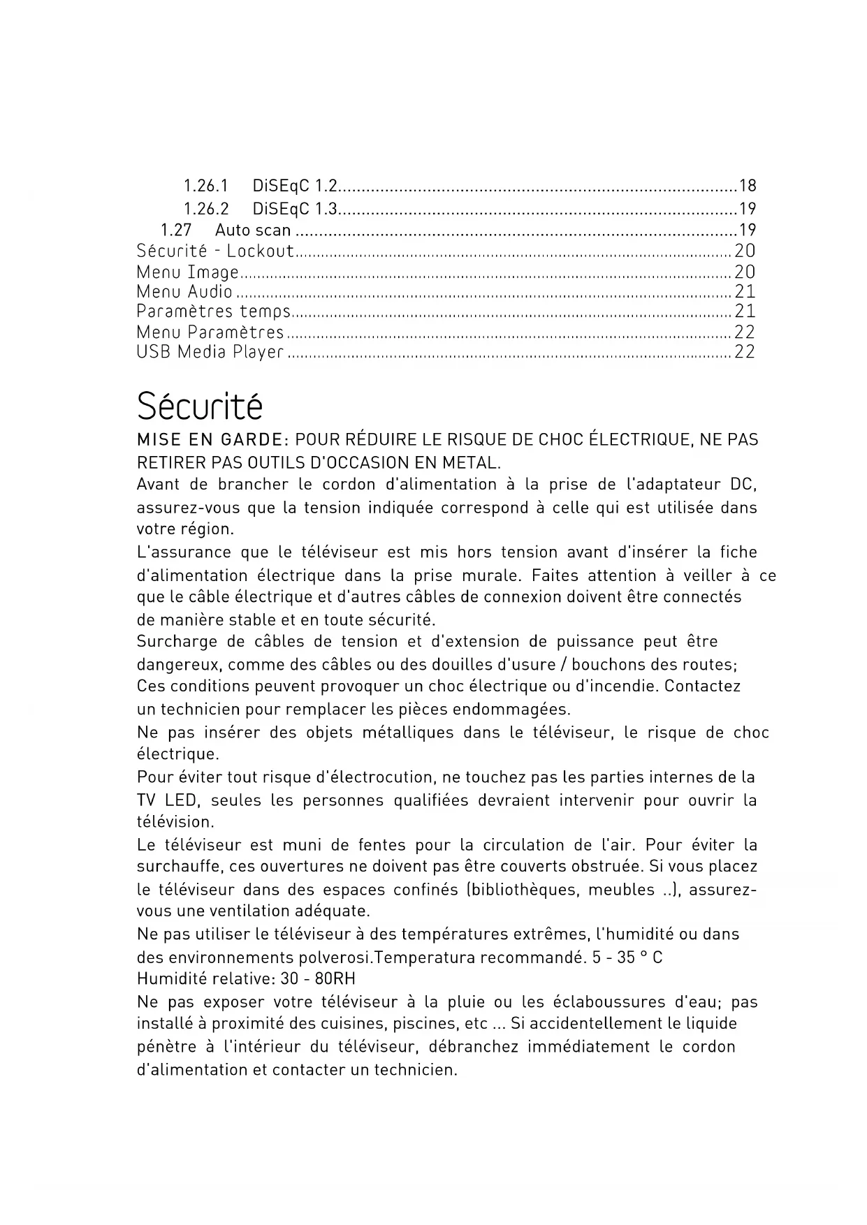 - ! USB Media Player ! Sécurité MISE EN GARDE: POUR RÉDUIRE LE RISQUE DE CHOC ÉLECTRIQUE, NE PAS RETIRER PAS OUTILS D'OCCASION EN METAL. Avant de brancher le cordon d'alimentation à la prise de l'adaptateur DC, assurez-vous que la tension indiquée correspond à celle qui est utilisée dans votre région. L'assurance que le téléviseur est mis hors tension avant d'insérer la fiche d'alimentation électrique dans la prise murale. Faites attention à veiller à ce que le câble électrique et d'autres câbles de connexion doivent être connectés de manière stable et en toute sécurité. Surcharge de câbles de tension et d'extension de puissance peut être dangereux, comme des câbles ou des douilles d'usure / bouchons des routes; Ces conditions peuvent provoquer un choc électrique ou d'incendie. Contactez un technicien pour remplacer les pièces endommagées. Ne pas insérer des objets métalliques dans le téléviseur, le risque de choc électrique. Pour éviter tout risque d'électrocution, ne touchez pas les parties internes de la TV LED, seules les personnes qualifiées devraient intervenir pour ouvrir la télévision. Le téléviseur est muni de fentes pour la circulation de l'air. Pour éviter la surchauffe, ces ouvertures ne doivent pas être couverts obstruée. Si vous placez le téléviseur dans des espaces confinés (bibliothèques, meubles ), assurez- vous une ventilation adéquate. Ne pas utiliser le téléviseur à des températures extrêmes, l'humidité ou dans des environnements polverosi.Temperatura recommandé. 5 - 35 ° C Humidité relative: 30 - 80RH Ne pas exposer votre téléviseur à la pluie ou les éclaboussures d'eau; pas installé à proximité des cuisines, piscines, etc Si accidentellement le liquide pénètre à l'intérieur du téléviseur, débranchez immédiatement le cordon d'alimentation et contacter un technicien.4 Vous pouvez nettoyer l'écran LED / LCD si nécessaire avec un chiffon doux et humide, ne pas oublier de débrancher le téléviseur avant de le nettoyer. Ne pas utiliser de solvants tels que le benzène pour nettoyer le téléviseur, peut endommager la surface de l'écran. Placez le téléviseur sur une surface solide et le manipuler avec attenzione.lo écran est formé par un verre mince et protégé par une feuille de matière plastique, produits liquides abrasifs ou de bandes ruine en permanence le panneau LCD / LED. Ne pas nettoyer l'écran avec des substances telles que: l'acétone, l'alcool éthylique, le toluène, l'acide d'éthyle, le méthyle ou l'hydrogène; ces substances ruine la LED du panneau / LCD. Placez le téléviseur afin qu'il soit accès plus facile à la prise de courant. Ne mettez pas chaleur ou de flammes, comme des bougies, sur le téléviseur. Aucun objet rempli de liquides tels que des vases ou des bouteilles doit être placé sur ou à proximité du téléviseur. p. 22