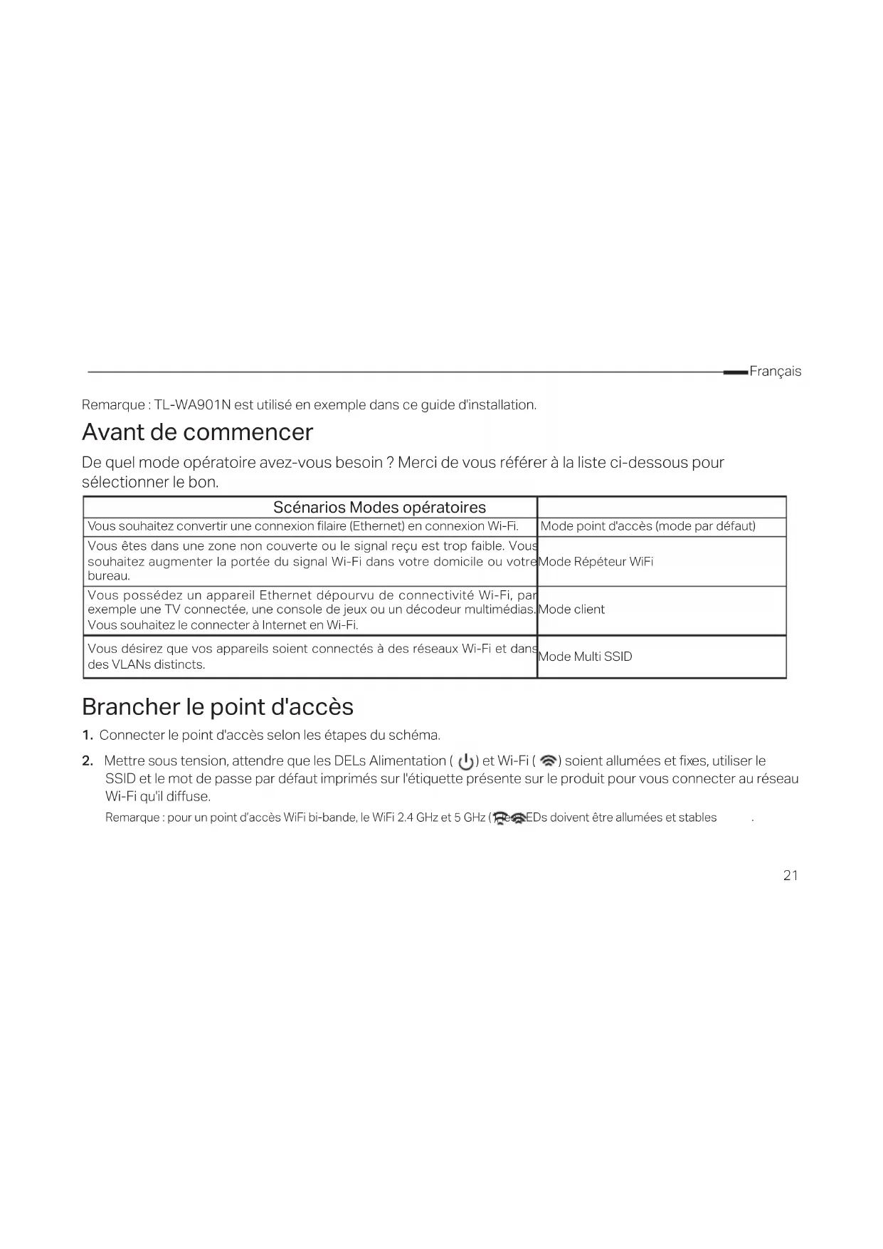 - Μετακινήστε τη συσκευή AP σε νέα θέση μακριά από συσκευές Bluetooth και άλλες οικιακές συσκευές όπως ασύρματα τηλέφωνα, φούρνους μικροκυμάτων, συσκευές παρακολούθησης βρεφών κ.ά.τ., ώστε να ελαχιστοποιήσετε τις παρεμβολές.21 Français Remarque : TL-WA901N est utilisé en exemple dans ce guide d'installation. Avant de commencer De quel mode opératoire avez-vous besoin ? Merci de vous référer à la liste ci-dessous pour sélectionner le bon. Scénarios Modes opératoires Vous souhaitez convertir une connexion laire (Ethernet) en connexion Wi-Fi. Mode point d'accès (mode par défaut) Vous êtes dans une zone non couverte ou le signal reçu est trop faible. Vous souhaitez augmenter la portée du signal Wi-Fi dans votre domicile ou votre bureau. Mode Répéteur WiFi Vous possédez un appareil Ethernet dépourvu de connectivité Wi-Fi, par exemple une TV connectée, une console de jeux ou un décodeur multimédias. Vous souhaitez le connecter à Internet en Wi-Fi. Mode client Vous désirez que vos appareils soient connectés à des réseaux Wi-Fi et dans des VLANs distincts. Mode Multi SSID Brancher le point d'accès