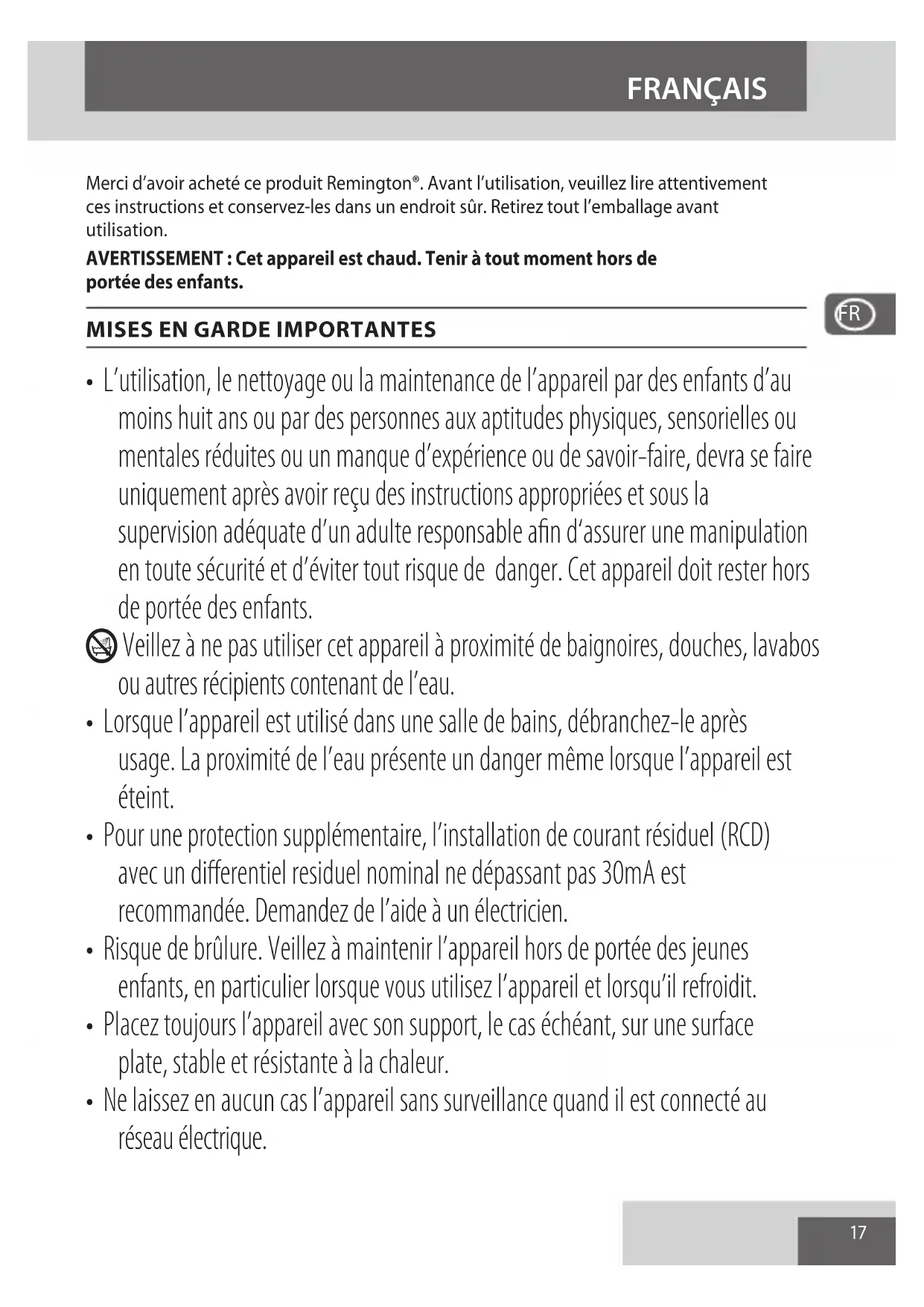 - Si le cordon d’alimentation de cet appareil est endommagé, cessez immédiatement d’utiliser l’appareil et renvoyez-le au service consommateurs Remington agréé le plus proche en vue de sa réparation ou de sa substitution afin d’éviter tout risque.
