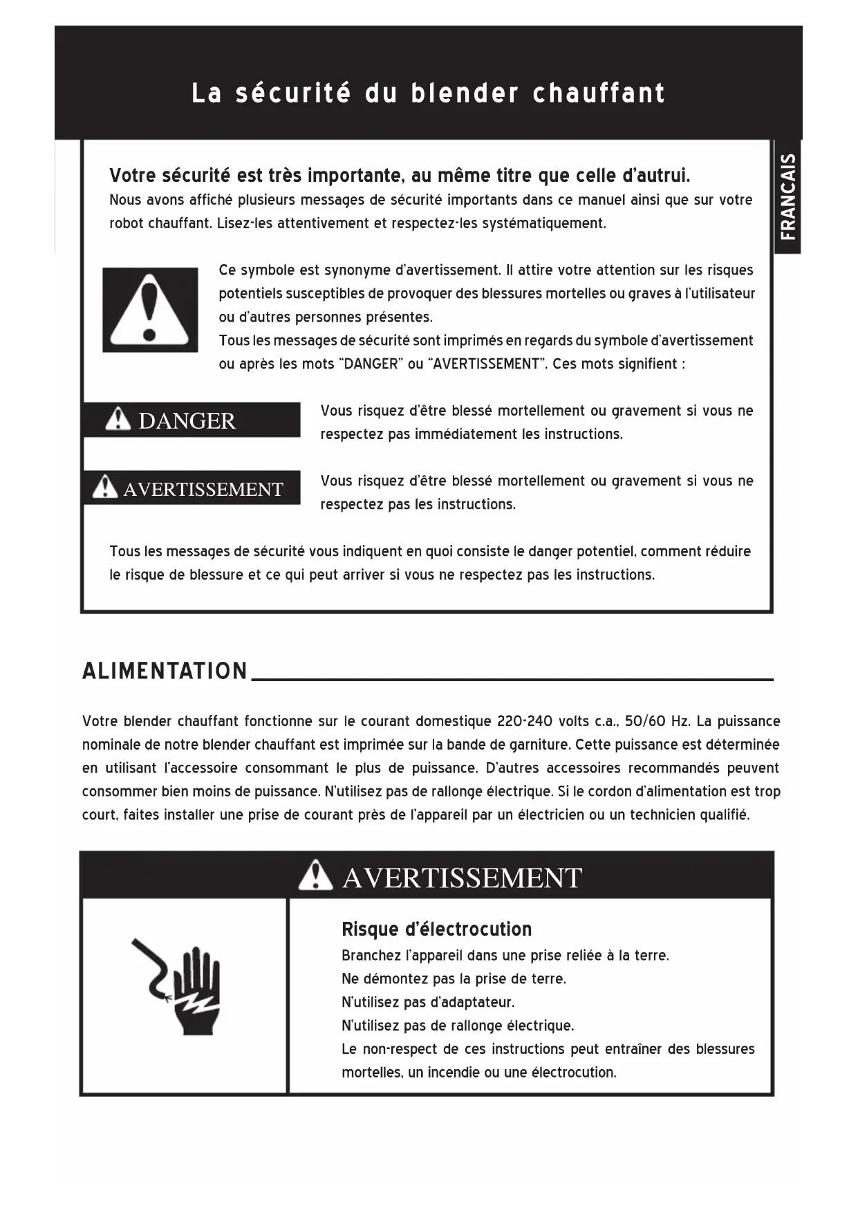 This marking indicates that this product should not be disposed with other household wastes throu- ghout the EU. To prevent possible harm to the environment or human health from uncontrolled waste disposal, recycle it responsibly to promote the sustainable reuse of material resources. To return your used device, please use the return and collection systems or contact the retailer where the product was purchased. They can take this product for environmental safe recycling. ENGLISHENGLISHLa sécurité du blender chauffant Votre sécurité est très importante, au même titre que celle d’autrui. Nous avons affiché plusieurs messages de sécurité importants dans ce manuel ainsi que sur votre robot chauffant. Lisez-les attentivement et respectez-les systématiquement. Ce symbole est synonyme d’avertissement. Il attire votre attention sur les risques potentiels susceptibles de provoquer des blessures mortelles ou graves à l’utilisateur ou d’autres personnes présentes. Tous les messages de sécurité sont imprimés en regards du symbole d’avertissement ou après les mots “DANGER” ou “AVERTISSEMENT”. Ces mots signifient : Vous risquez d’être blessé mortellement ou gravement si vous ne respectez pas immédiatement les instructions. Vous risquez d’être blessé mortellement ou gravement si vous ne respectez pas les instructions. Tous les messages de sécurité vous indiquent en quoi consiste le danger potentiel, comment réduire le risque de blessure et ce qui peut arriver si vous ne respectez pas les instructions. A L I M E N T A T I O N __________________________________________________ Votre blender chauffant fonctionne sur le courant domestique 220-240 volts c.a., 50/60 Hz. La puissance nominale de notre blender chauffant est imprimée sur la bande de garniture. Cette puissance est déterminée en utilisant l’accessoire consommant le plus de puissance. D’autres accessoires recommandés peuvent consommer bien moins de puissance. N’utilisez pas de rallonge électrique. Si le cordon d’alimentation est trop court, faites installer une prise de courant près de l’appareil par un électricien ou un technicien qualifié. Risque d’électrocution Branchez l’appareil dans une prise reliée à la terre. Ne démontez pas la prise de terre. N’utilisez pas d’adaptateur. N’utilisez pas de rallonge électrique. Le non-respect de ces instructions peut entraîner des blessures mortelles, un incendie ou une électrocution. DANGER AVERTISSEMENT AVERTISSEMENT FRANCAISIMPORTANT : consignes de sécurité Lorsque vous utilisez des appareils électriques, vous devez prendre des précautions élémentaires.