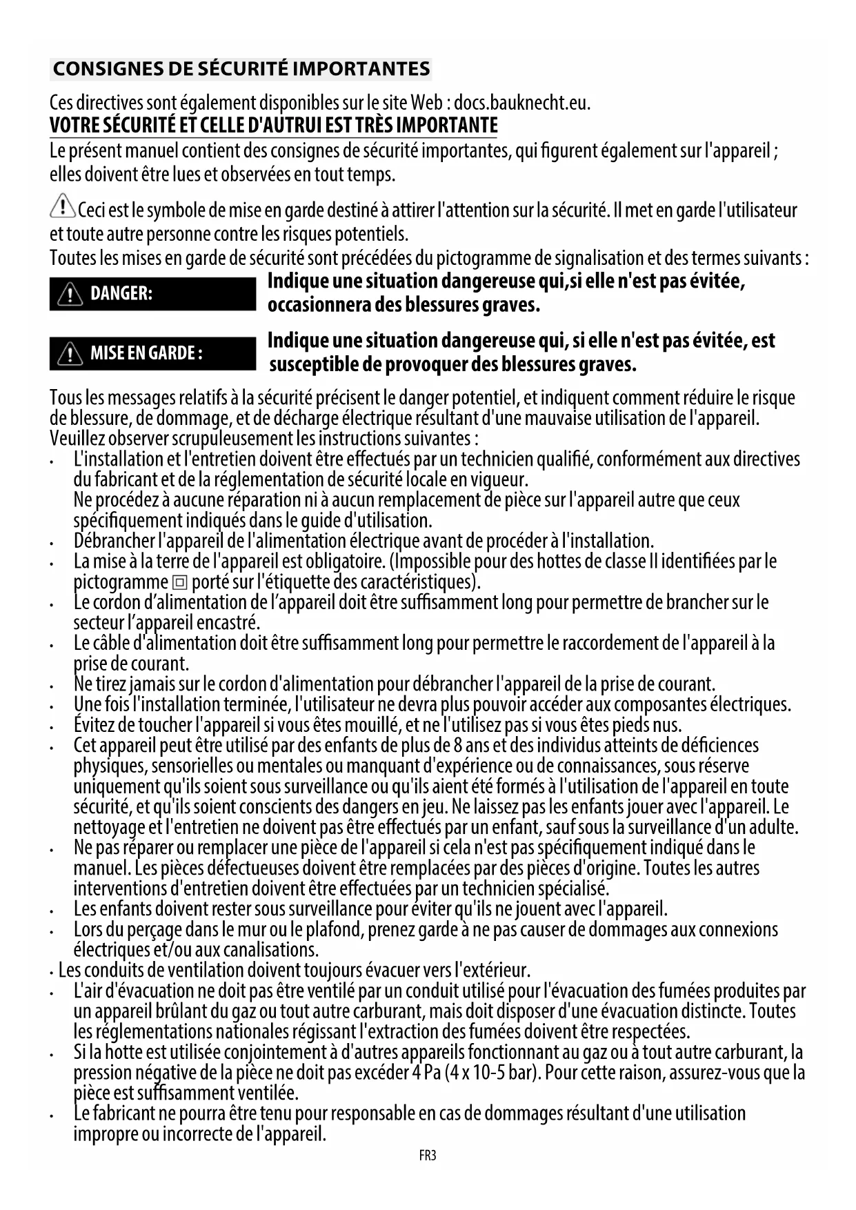 Ces directives sont également disponibles sur le site Web: docs.bauknecht.eu. VOTRE SÉCURITÉ ET CELLE D'AUTRUI EST TRÈS IMPORTANTE Le présent manuel contient des consignes de sécurité importantes, qui gurent également sur l'appareil ; elles doivent être lues et observées en tout temps. Ceci est le symbole de mise en garde destiné à attirer l'attention sur la sécurité. Il met en garde l'utilisateur et toute autre personne contre les risques potentiels. Toutes les mises en garde de sécurité sont précédées du pictogramme de signalisation et des termes suivants :