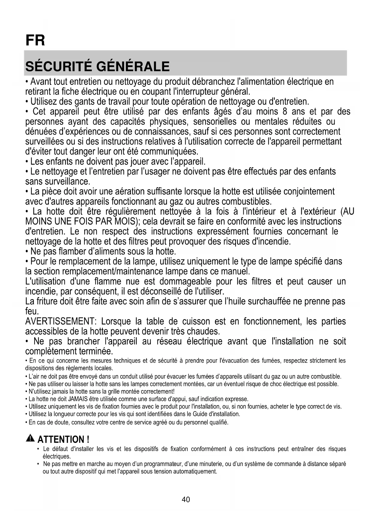 - La hotte doit être régulièrement nettoyée à la fois à l'intérieur et à l'extérieur (AU MOINS UNE FOIS PAR MOIS); cela devrait se faire en conformité avec les instructions d'entretien. Le non respect des instructions expressément fournies concernant le nettoyage de la hotte et des filtres peut provoquer des risques d'incendie.