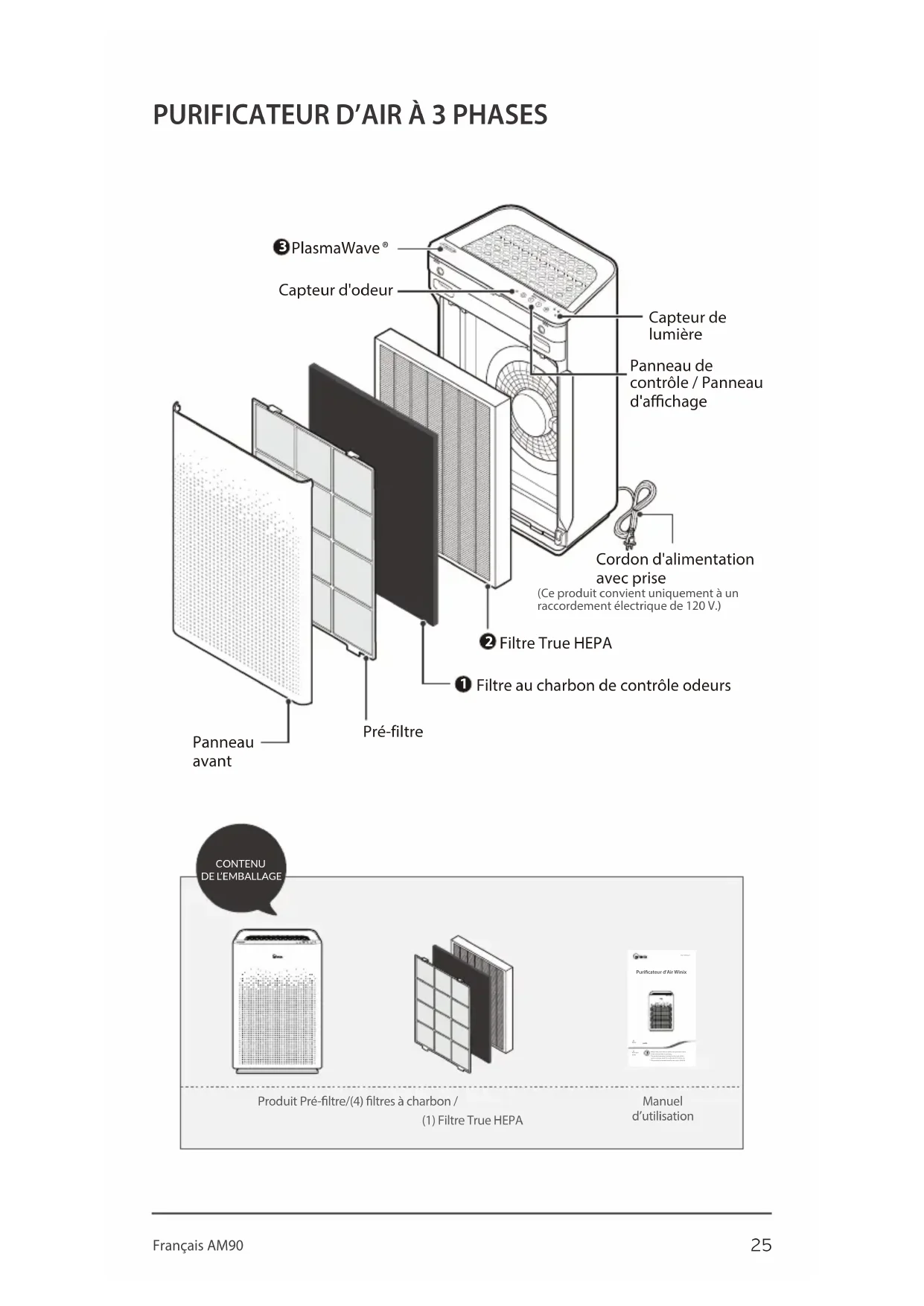Français AM90 COMMANDES Grille du ventilateur Capteur de lumière Détecte la quantité delumière ambiante pourajuster la luminosité desindicateurs à DEL. Indicateur PlasmaWave
