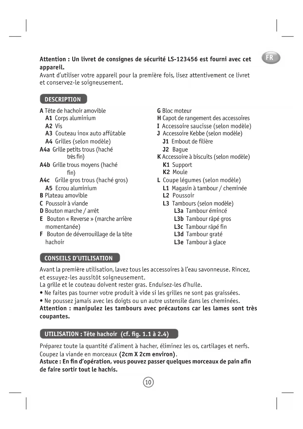 - Appuyez sur la position « I » du bouton marche/arrêt (D) pour continuer le hachage. ACCESSOIRE SAUCISSES (cf. fig. 3.1 à 3.6) Important : cet accessoire n’est à utiliser qu’après avoir haché la viande, avoir rajouté l’assaisonnement et avoir bien brassé la préparation. Après avoir laissé le boyau tremper dans de l’eau tiède pour retrouver son élasticité, enfilez-le sur l’entonnoir en laissant dépasser 5 cm (que vous obturerez en faisant un noeud avec un lien). Mettez en marche l’appareil, alimentez le hachoir en hachis et faire suivre le boyau à mesure que celui-ci se remplit. Nota : ce travail se fera plus facilement à deux, l’un s’occupera d’approvisionner en hachis, l’autre s’occupera du remplissage du boyau. Donner aux saucisses la longueur désirée en pinçant et en tournant le boyau. Pour avoir une saucisse de qualité, prenez soin d’éviter d’emprisonner de l’air lors du remplissage et faites des saucisses de 10 à 15 cm (séparez les saucisses en plaçant un lien et en faisant un noeud à l’aide de celui-ci). ACCESSOIRE KEBBE (cf. fig. 4.1 et 4.3) Conseil pratique : Pour la réalisation de la pâte fine de Kebbe ou Kefta, passer la viande 2 à 3 fois dans la tête de hachoir jusqu’à obtention de la finesse désirée. ACCESSOIRE À BISCUITS (cf. fig. 5.1 à 5.3) Préparez la pâte. Vous obtiendrez de meilleurs résultats avec une pâte un peu molle. Choisissez le dessin en faisant correspondre la flèche et la forme choisie. Approvisionnez jusqu’à ce que vous ayiez obtenu la quantité de biscuits désirée. COUPE LÉGUMES (cf. fig.6.1 à 6.3) Conseils pour obtenir de bons résultats : Les ingrédients que vous utilisez doivent être fermes pour obtenir des résultats satisfaisants et éviter toute accumulation d’aliment dans le magasin. Ne pas utiliser l’appareil pour râper ou trancher des aliments trop durs tels que du sucre ou des morceaux de viande. FR12 NETTOYAGE (cf. fig. 7.1 à 7.4) RANGEMENT DES ACCESSOIRES (cf. fig 8.1 à 8.2) FR13 Note: Safety instruction booklet LS-123456 is supplied with the appliance. Before using your appliance for the first time, read the booklet carefully and keep it in a safe place. DESCRIPTION A Removable mincer head A1 Aluminium casing A2 Screw A3 Self-sharpening stainless steel blade A4 Grilles (depending on model) A4a Small-hole grille (very fine mincing) A4b Medium-hole grille (fine mincing) A4c Large-hole grille (coarse mincing) A5 Aluminium nut B Removable tray C Meat pusher D On/off button E «Reverse» button (short reverse movement) F Mincer head release button G Motor unit H Accessory storage cover I Sausage accessory (depending on model) J Kebbe accessory (depending on model) J1 Die end piece J2 Ring K Biscuit maker accessory (depending on model) K1 Support K2 Mould L Vegetable chopper (depending on model) L1 Drum body/feed tube L2 Pusher L3 Drums (depending on model) L3a Slicing drum L3b Coarse grating drum L3c Fine grating drum L3d Scraper drum L3e Ice shaving drum USE Before using for the first time, wash all the accessories in soapy water. Rinse and dry them carefully. The grille and the blade should be lightly greased. Coat them with oil.