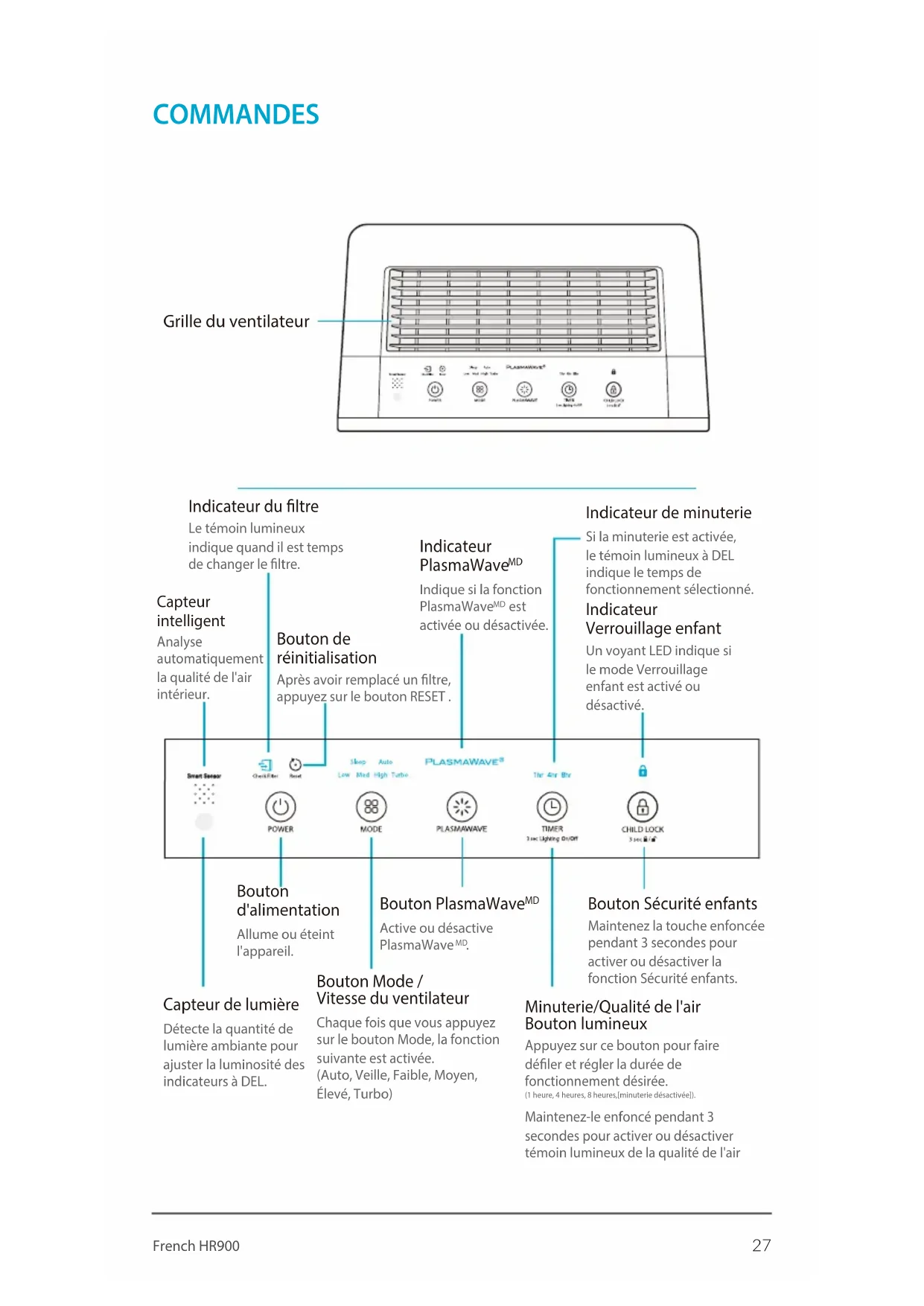 HR900 CONTENU DE L'EMBALLAGE27 French HR900 COMMANDES Grille du ventilateur Capteur de lumière Détecte la quantité de lumière ambiante pour ajuster la luminosité des indicateurs à DEL. Bouton Mode / Vitesse du ventilateur Chaque fois que vous appuyez sur le bouton Mode, la fonction suivante est activée. (Auto, Veille, Faible, Moyen, Élevé, Turbo) Bouton Sécurité enfants Maintenez la touche enfoncée pendant 3 secondes pour activer ou désactiver la fonction Sécurité enfants. Indicateur de minuterie Si la minuterie est activée, le témoin lumineux à DEL indique le temps de fonctionnement sélectionné. Minuterie/Qualité de l'air Bouton lumineux Appuyez sur ce bouton pour faire déler et régler la durée de fonctionnement désirée. Maintenez-le enfoncé pendant 3 secondes pour activer ou désactiver témoin lumineux de la qualité de l'air(1 heure, 4 heures, 8 heures,[minuterie désactivée]). Lorem ipsum Capteur intelligent Analyse automatiquement la qualité de l'air intérieur. Bouton de réinitialisation Après avoir remplacé un ltre, appuyez sur le bouton RESET . Bouton d'alimentation Allume ou éteint l'appareil. Indicateur Verrouillage enfant Un voyant LED indique si le mode Verrouillage enfant est activé ou désactivé. Indicateur du ltre Le témoin lumineux indique quand il est temps de changer le ltre. Indicateur PlasmaWave