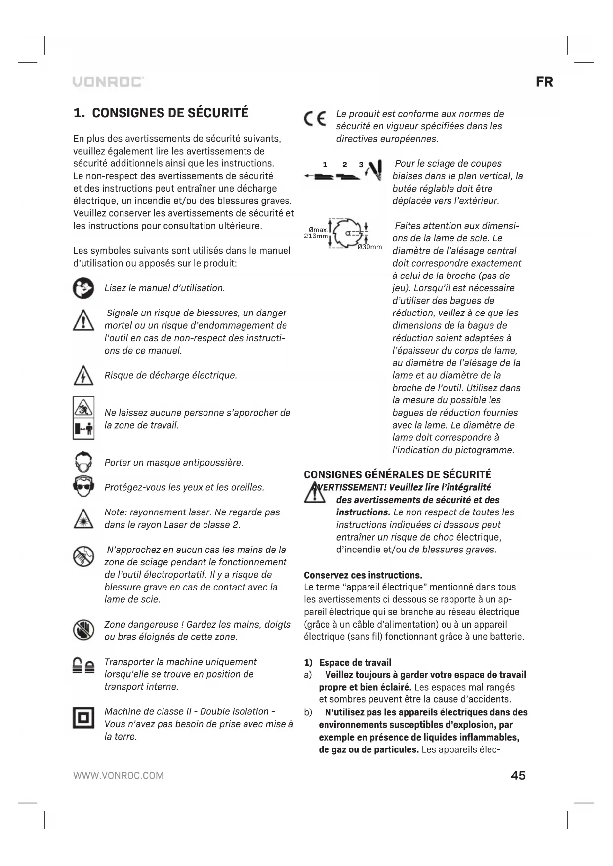 Pour le sciage de coupes biaises dans le plan vertical, la butée réglable doit être déplacée vers l’extérieur. Ø30mm Ømax. 216mm Faites attention aux dimensi- ons de la lame de scie. Le diamètre de l’alésage central doit correspondre exactement à celui de la broche (pas de jeu). Lorsqu’il est nécessaire d’utiliser des bagues de réduction, veillez à ce que les dimensions de la bague de réduction soient adaptées à l’épaisseur du corps de lame, au diamètre de l’alésage de la lame et au diamètre de la broche de l’outil. Utilisez dans la mesure du possible les bagues de réduction fournies avec la lame. Le diamètre de lame doit correspondre à l’indication du pictogramme. CONSIGNES GÉNÉRALES DE SÉCURITÉ AVERTISSEMENT! Veuillez lire l’intégralité des avertissements de sécurité et des instructions. Le non respect de toutes les instructions indiquées ci dessous peut entraîner un risque de choc électrique, d’incendie et/ou de blessures graves. Conservez ces instructions. Le terme “appareil électrique” mentionné dans tous les avertissements ci dessous se rapporte à un ap- pareil électrique qui se branche au réseau électrique (grâce à un câble d’alimentation) ou à un appareil électrique (sans fil) fonctionnant grâce à une batterie.
