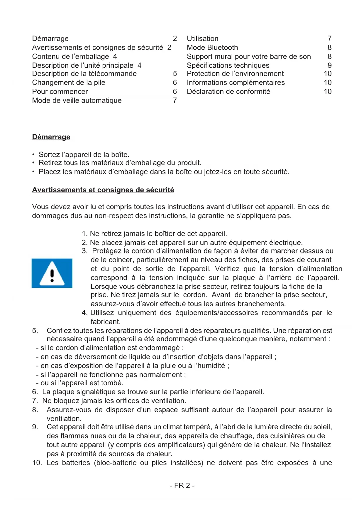 Démarrage 2 Avertissements et consignes de sécurité 2 Contenu de l’emballage 4 Description de l’unité principale 4 Description de la télécommande 5 Changement de la pile 6 Pour commencer 6 Mode de veille automatique 7 Utilisation 7 Mode Bluetooth 8 Support mural pour votre barre de son 8 Spécications techniques 9 Protection de l’environnement 10 Informations complémentaires 10 Déclaration de conformité 10- FR 3 - chaleur excessive, comme les rayons du soleil, un incendie, etc.