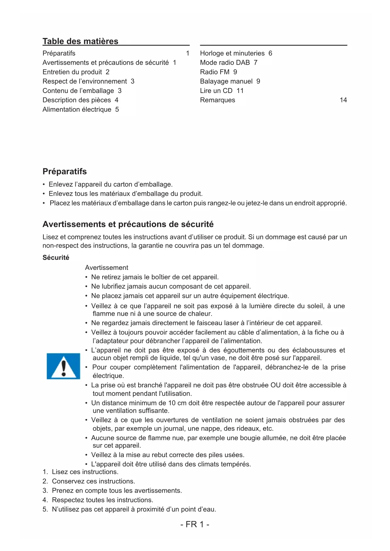 Préparatifs 1 Avertissements et précautions de sécurité 1 Entretien du produit 2 Respect de l’environnement 3 Contenu de l’emballage 3 Description des pièces 4 Alimentation électrique 5 Horloge et minuteries 6 Mode radio DAB 7 Radio FM 9 Balayage manuel 9 Lire un CD 11 Remarques : 14
