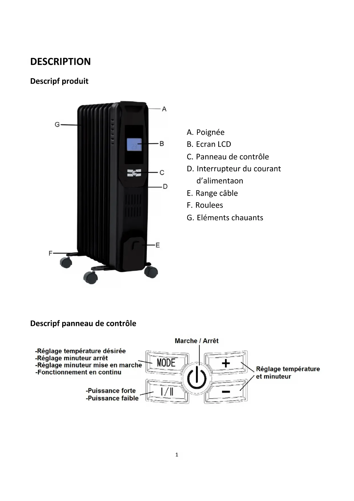 A. Poignée B. Ecran LCD C. Panneau de contrôle D. Interrupteur du courant d’alimentation E. Range câble F. Roulettes G. Eléments chauffantsFRANÇAIS