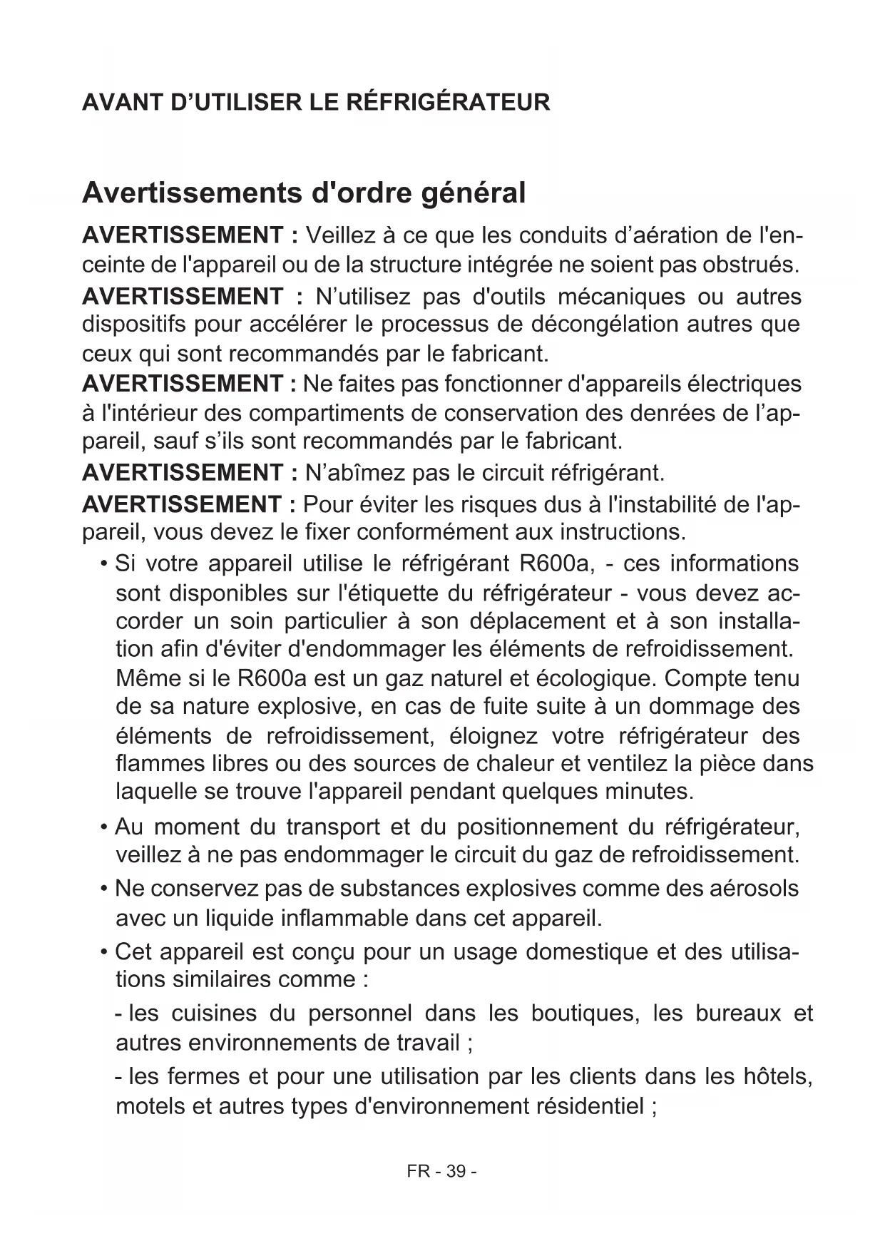 Index AVANT D’UTILISER LE RÉFRIGÉRATEUR .......................................... 39 Avertissements d'ordre général .......................................................................39 Réfrigérateurs anciens et hors service