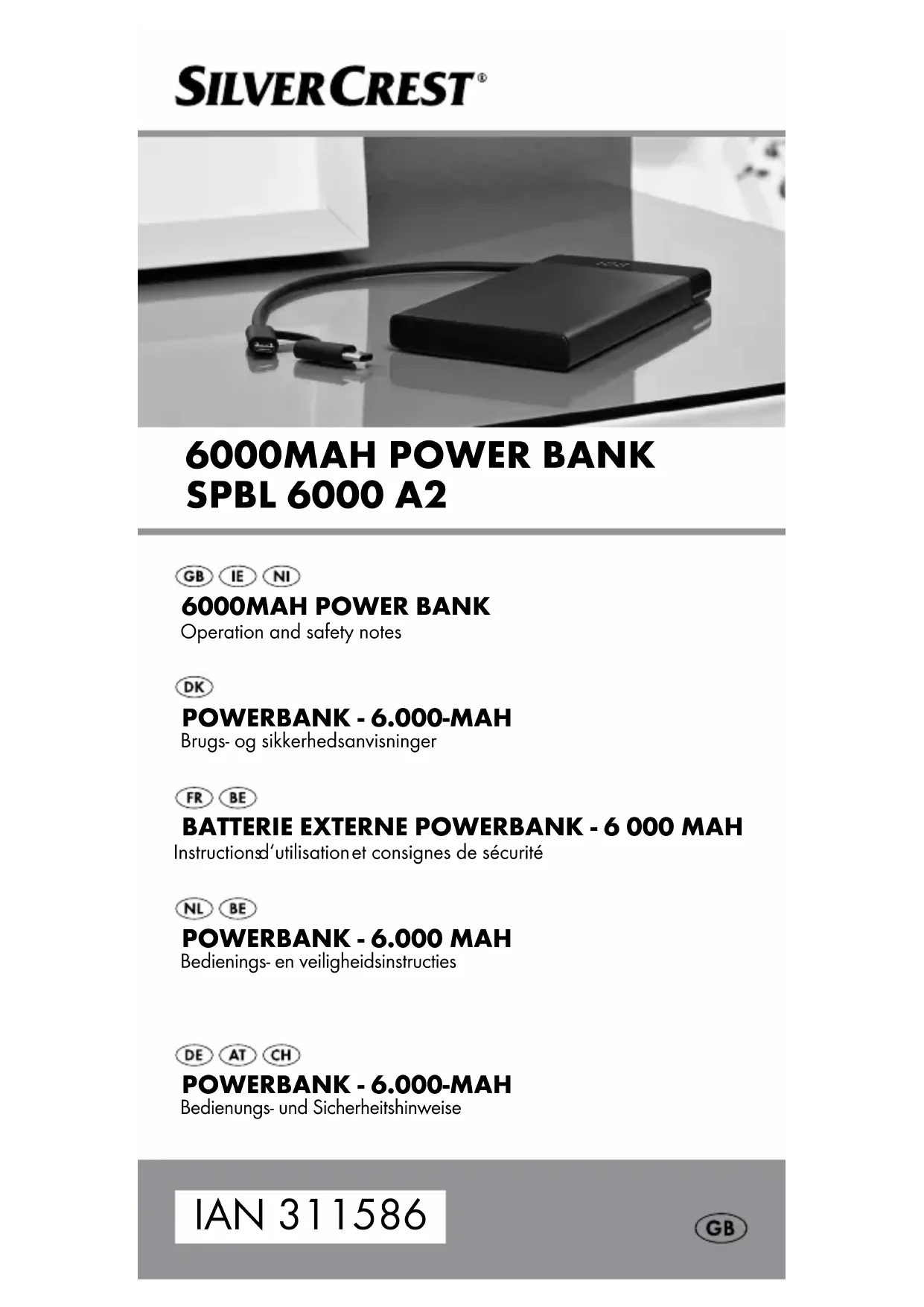 est une marque déposée de USB Implementers Forum, Inc.. - La marque et le nom SilverCrest sont la propriété de leurs détenteurs respectifs. - Tous les autres noms ou produits peuvent être des marques ou des marques déposées de leur propriétaire respectif. Contenu de la livraison 1 batterie externe Powerbank - 6 000 mAh 1 câble adaptateur Micro USB - USB Type-C 1 mode d‘emploi32 FR/BE Avant la mise en service Remarque : veuillez retirer l‘ensemble des matériaux composant l‘emballage du produit. Vérifiez si le contenu de la livraison présente des dom- mages apparents. Si vous remarquez des dommages quelconques sur le produit ou une pièce manquante, veuillez vous référer au commerçant qui vous a vendu le produit. Descriptif des pièces Observez également à cet effet le rabat.