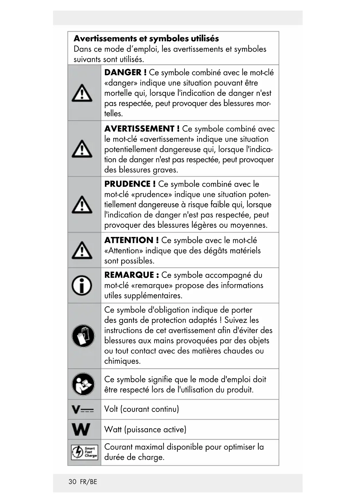 - Si toutes les sorties sont utilisées en même temps, le courant total absorbé par l‘appareil connecté ne doit pas dépasser 3 A. Consignes de sécurité Avant d‘utiliser le produit pour la première fois, veuillez lire soigneusement toutes les instructions d‘utilisation et de sécu- rité. Lorsque vous remettez l‘appareil à d‘autres utilisateurs, veuillez également leur transmettre tous les documents s‘y rapportant. Avant d‘utiliser le produit, contrôlez la présence de dom- mages externes et visibles. Ne faites jamais fonctionner un produit endommagé ou tombé par terre. Ce produit peut être utilisé par des enfants de 8 ans et plus ainsi que par des personnes avec des capacités physiques, psychiques ou sensorielles limitées ou manquant d‘expé- rience ou de connaissance, s‘ils sont surveillés ou s‘ils ont été informés de l‘utilisation du produit de manière sûre et comprennent les risques découlant de son utilisation. Ne laissez pas les enfants jouer avec le produit. Le nettoyage et la maintenance domestique du produit ne doivent pas être effectués par un enfant sans surveillance. DANGER Les matériaux composant l‘emballage ne sont pas des jouets. Tenir tous les matériaux composant l‘em- ballage hors de la portée des enfants. Risque d‘asphyxie !34 FR/BE Utilisez toujours le produit sur une surface stable et plane. Il risque d‘être endommagé en cas de chute. N‘exposez pas le produit aux rayons directs du soleil ou à des températures élevées. Autrement, il peut surchauffer et subir des dommages irréparables. N‘utilisez pas le produit à proximité de sources de cha- leur, telles que des radiateurs ou autres dispositifs émet- tant de la chaleur. Ne faites pas fonctionner le produit à proximité de flammes nues. Le produit n‘est pas conçu pour être utilisé dans des lo- caux à haute température ou humidité (par ex. salle de bains) ou à une exposition excessive à la poussière. Assurez-vous qu‘aucun corps étranger ne puisse pénétrer à l‘intérieur du produit. N’exposez pas le produit à des chaleurs extrêmes. Cela vaut en particulier pour le stockage dans une voiture. En cas d‘immobilisation prolongée, des températures ex- trêmes peuvent être atteintes à l‘intérieur de la voiture et dans la boîte à gants. Sortez les appareils électriques et électroniques du véhicule. N‘utilisez pas le produit directement lorsqu‘il est déplacé d‘une pièce froide à une pièce chaude. Laissez d‘abord le produit s‘acclimater avant de l‘allumer. AVERTISSEMENT N‘ouvrez jamais le boîtier du produit. Des composants qui ne nécessitent aucune maintenance se trouvent dans le produit. Ne procédez à aucune modification sur le produit. Ne confiez la réparation du produit qu‘à des entreprises spécialisées autorisées ou au service client. Des répara- tions incorrectes peuvent être source de dangers impor- tants pour l’utilisateur. Le cas échéant, le droit de garantie est annulé. N‘exposez pas le produit à des projections d‘eau et / ou de gouttes d‘eau et ne posez pas d‘objets remplis de liquide comme des vases ou des boissons ouvertes sur ou près du produit.35 FR/BE Si vous constatez une odeur de brûlé ou un dégagement de fumée, éteignez immédiatement le produit et débran- chez le câble qui y est branché s‘il y en a un. Faites vérifier le produit si nécessaire par un professionnel avant de le réutiliser. Lors de l‘utilisation d‘une alimentation USB, la prise de courant utilisée doit être facile d‘accès afin que l‘alimen- tation USB puisse être retirée rapidement en cas de situa- tion de danger. Respecter à cet effet le mode d‘emploi du fabricant. AVERTISSEMENT Une mauvaise manipulation des batteries peut entraîner des incendies, explosions, écou- lements de substances dangereuses ou d‘autres situations dangereuses ! Ne jetez pas le produit au feu, la batterie intégrée peut exploser. Respectez les contraintes d‘utilisation ainsi que les inter- dictions concernant les produits fonctionnant sur batterie dans des endroits présentant un danger, comme par ex. des réservoirs de carburant, des avions, des hôpitaux, etc. AVERTISSEMENT Ne pas couvrir le produit durant sa charge. Le produit peut autrement surchauffer. Mise en service et utilisation Recharger la batterie externe Du fait de la forte intensité absorbée par la batterie ex- terne, n‘utilisez jamais un ordinateur portable ou un port USB d‘un PC pour la recharger. Pour recharger la powerbank, utilisez uniquement une alimentation USB appropriée (5 V , min. 3 A ; non livrée). Avant d‘être utilisée, la batterie intégrée doit être complète- ment chargée. Pour recharger la batterie externe