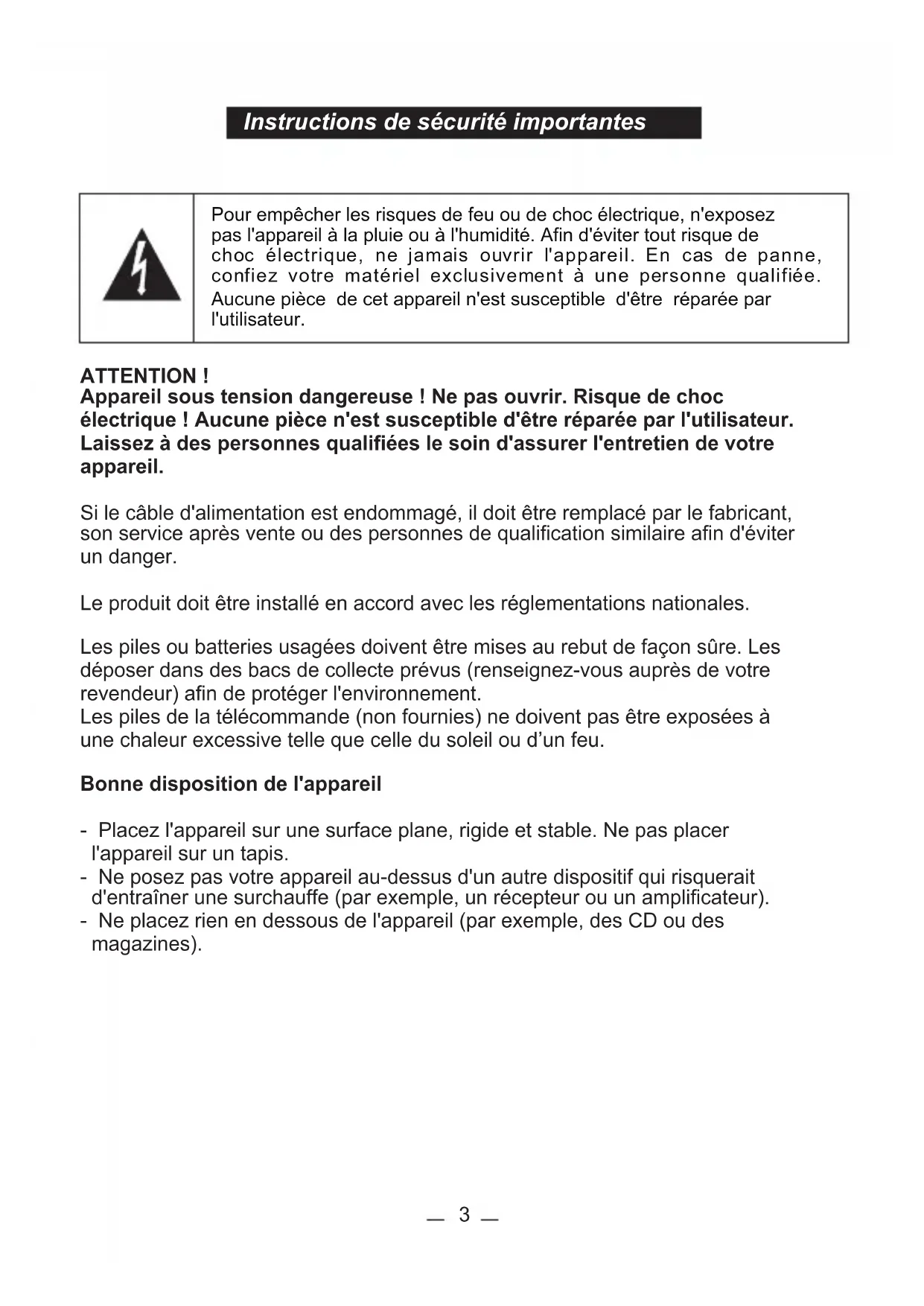 Getting Started Operations For ReferenceInstructions de sécurité importantes ATTENTION ! Appareil sous tension dangereuse ! Ne pas ouvrir. Risque de choc électrique ! Aucune pièce n'est susceptible d'être réparée par l'utilisateur. Laissez à des personnes qualifiées le soin d'assurer l'entretien de votre appareil. Si le câble d'alimentation est endommagé, il doit être remplacé par le fabricant, son service après vente ou des personnes de qualification similaire afin d'éviter un danger. Le produit doit être installé en accord avec les réglementations nationales. Les piles ou batteries usagées doivent être mises au rebut de façon sûre. Les déposer dans des bacs de collecte prévus (renseignez-vous auprès de votre revendeur) afin de protéger l'environnement. Les piles de la télécommande (non fournies) ne doivent pas être exposées à une chaleur excessive telle que celle du soleil ou d’un feu. Bonne disposition de l'appareil - Placez l'appareil sur une surface plane, rigide et stable. Ne pas placer l'appareil sur un tapis. - Ne posez pas votre appareil au-dessus d'un autre dispositif qui risquerait d'entraîner une surchauffe (par exemple, un récepteur ou un amplificateur). - Ne placez rien en dessous de l'appareil (par exemple, des CD ou des magazines). Pour empêcher les risques de feu ou de choc électrique, n'exposez pas l'appareil à la pluie ou à l'humidité. Afin d'éviter tout risque de choc électrique, ne jamais ouvrir l'appareil. En cas de panne, confiez votre matériel exclusivement à une personne qualifiée. Aucune pièce de cet appareil n'est susceptible d'être réparée par l'utilisateur. 3Espace de ventilation - Placez l'appareil dans un endroit suffisamment ventilé afin d'éviter une accumulation de chaleur interne. Laissez au moins un espace de 10cm à l'arrière et au-dessus de l'appareil ainsi qu'un espace de 5cm sur les côtés afin d'éviter toute surchauffe. - Ne pas obstruer les ouvertures de ventilation par des objets tels que des journaux, nappes, rideau, etc… Préservez l'appareil des températures élevées, de l'humidité, de l'eau et de la poussière. - L'appareil ne doit pas être exposé à des égouttements d'eau ou des éclaboussures. Aucun objet rempli de liquide tel que des vases ne doit être placé sur l'appareil. - Ne placez pas d'objets susceptibles d'endommager votre appareil près de ce dernier (par exemple, objets remplis de liquide ou bougies allumées). - Ne pas placer sur l'appareil de sources de flammes nues telles que des bougies allumées Alimentation électrique - Veuillez débrancher le produit en cas de non-utilisation prolongée. - Si le cordon d'alimentation est endommagé, celui-ci doit être remplacé par le fabricant, son service après-vente ou des personnes qualification similaire afin d'éviter un danger. - Cet appareil doit être relié à un réseau électrique 230V ~ 50Hz. - La prise d’alimentation réseau est utilisée comme dispositif de déconnection, ainsi la prise d’alimentation doit demeurer aisément accessible après installation du produit.