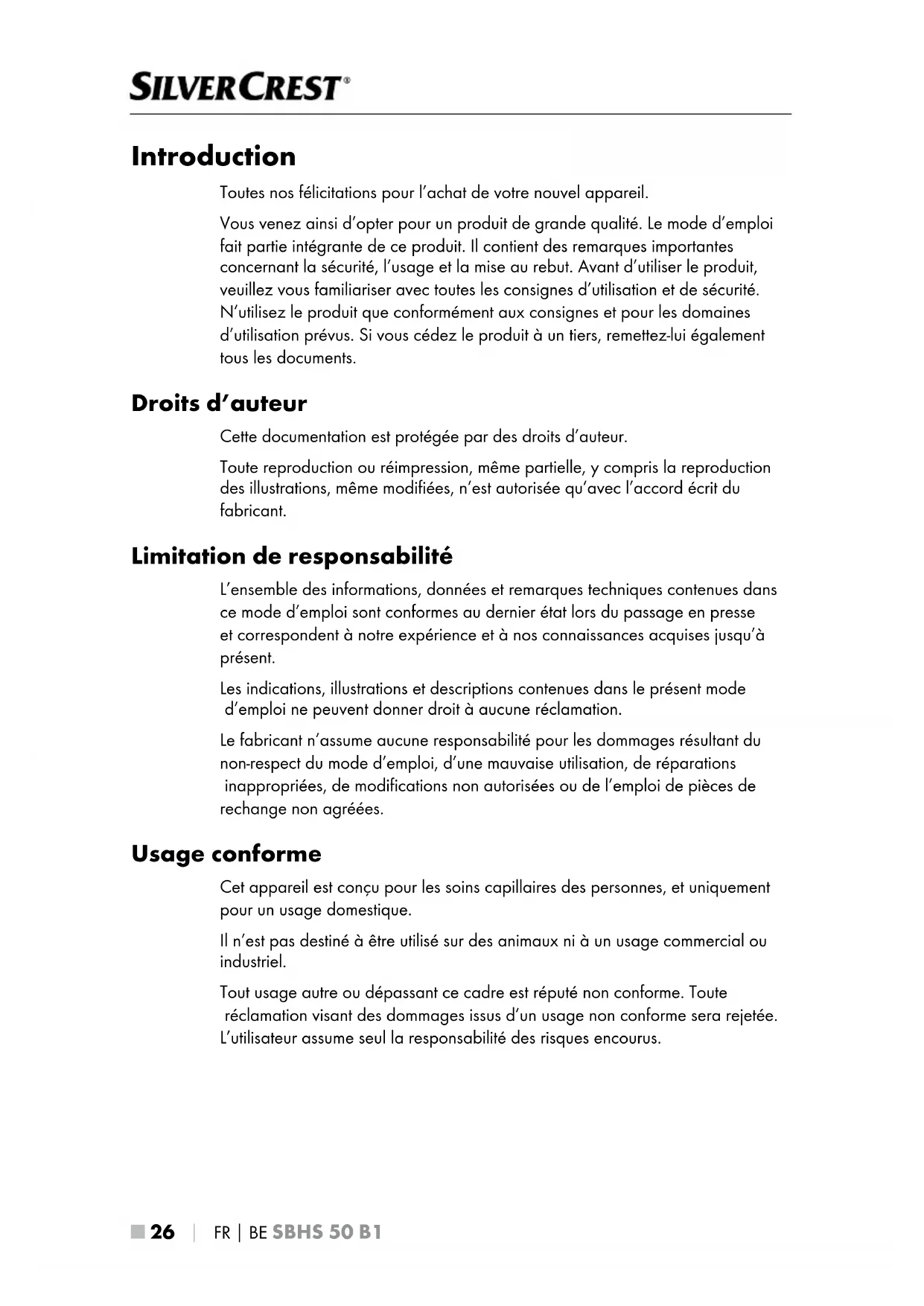 Introduction Toutes nos félicitations pour l’achat de votre nouvel appareil. Vous venez ainsi d’opter pour un produit de grande qualité. Le mode d’emploi fait partie intégrante de ce produit. Il contient des remarques importantes concernant la sécurité, l’usage et la mise au rebut. Avant d’utiliser le produit, veuillez vous familiariser avec toutes les consignes d’utilisation et de sécurité. N’utilisez le produit que conformément aux consignes et pour les domaines d’utilisation prévus. Si vous cédez le produit à un tiers, remettez-lui également tous les documents. Droits d’auteur Cette documentation est protégée par des droits d’auteur. Toute reproduction ou réimpression, même partielle, y compris la reproduction des illustrations, même modifiées, n’est autorisée qu’avec l’accord écrit du fabricant. Limitation de responsabilité L’ensemble des informations, données et remarques techniques contenues dans ce mode d’emploi sont conformes au dernier état lors du passage en presse et correspondent à notre expérience et à nos connaissances acquises jusqu’à présent. Les indications, illustrations et descriptions contenues dans le présent mode d’emploi ne peuvent donner droit à aucune réclamation. Le fabricant n’assume aucune responsabilité pour les dommages résultant du non-respect du mode d’emploi, d’une mauvaise utilisation, de réparations inappropriées, de modifications non autorisées ou de l’emploi de pièces de rechange non agréées. Usage conforme Cet appareil est conçu pour les soins capillaires des personnes, et uniquement pour un usage domestique. Il n’est pas destiné à être utilisé sur des animaux ni à un usage commercial ou industriel. Tout usage autre ou dépassant ce cadre est réputé non conforme. Toute réclamation visant des dommages issus d’un usage non conforme sera rejetée. L’utilisateur assume seul la responsabilité des risques encourus.FR