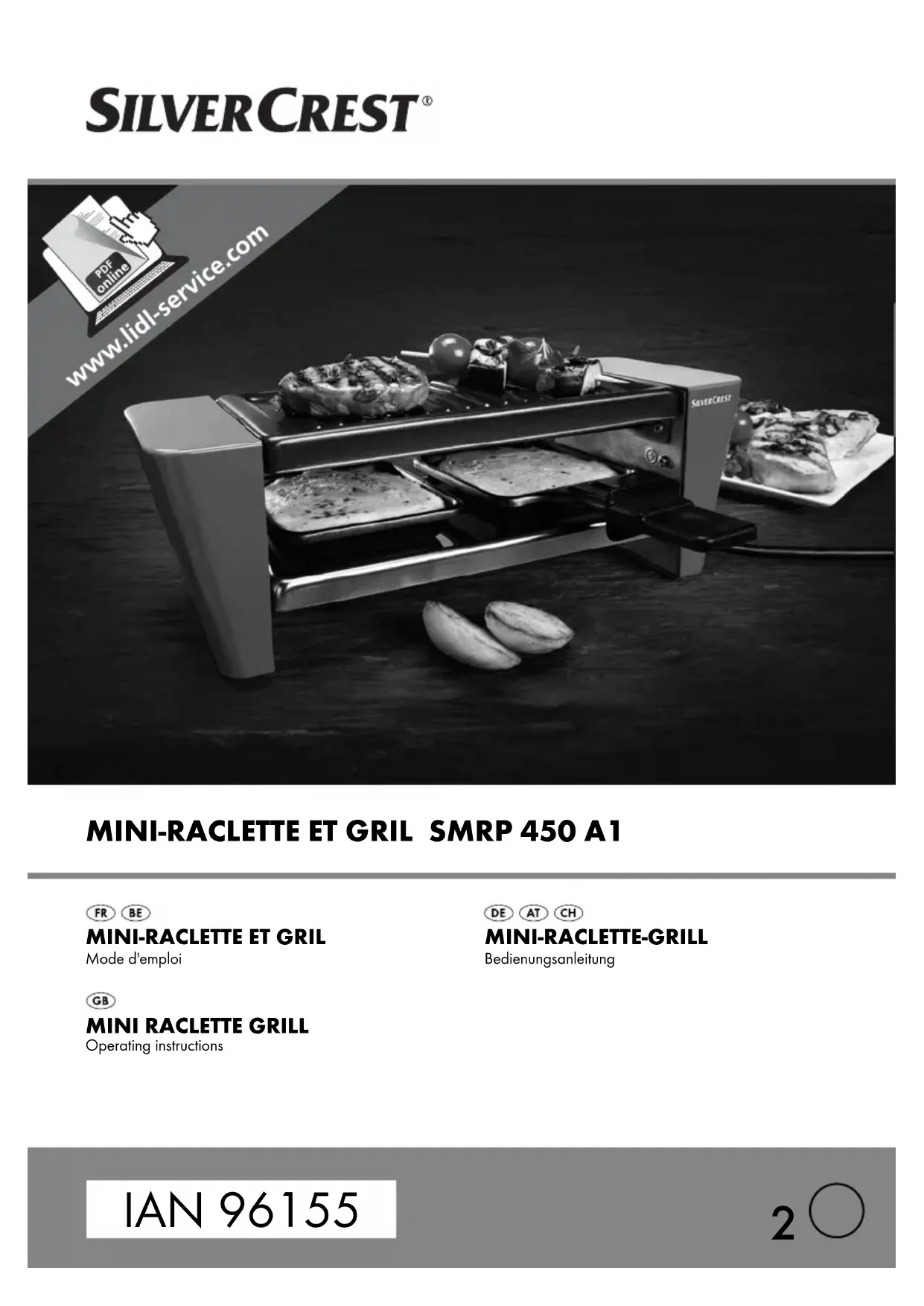 SMRP 450 A1 Introduction Toutes nos félicitations pour l'achat de votre nouvel appareil. Ainsi, vous venez d'opter pour un produit de grande qualité. Le mode d'emploi fait partie de ce produit. Il contient des remarques importantes concernant la sécurité, l'usage et la mise au rebut. Avant l'usage du produit, veuillez vous familiariser avec toutes les consignes d'utilisation et de sécurité. N'utilisez le produit que conformément aux consignes et pour les domaines d'utilisation prévus. Si vous cédez le produit à un tiers, remettez-lui également tous les documents. Usage conforme Cet appareil sert exclusivement à la grillade et à la cuisson de produits alimentaires à l'intérieur. Cet appareil est exclusivement réservé à un usage domestique. Veuillez ne pas l'utiliser à des fi ns professionnelles. Matériel livré Mini-raclette et gril (base et plaque de grill) 2 Poêlons 2 Spatules en bois Mode d'emploi REMARQUE Contrôlez le matériel livré directement après avoir procédé au déballage afi n de vous assurer que tout est complet et que rien n'a été endommagé. Si nécessaire, veuillez vous adresser au service après-vente. Description de l'appareil Figure A: 1 Plaque de grill 2 Commutateur MARCHE/ARRÊT (avec témoin lumineux intégré)