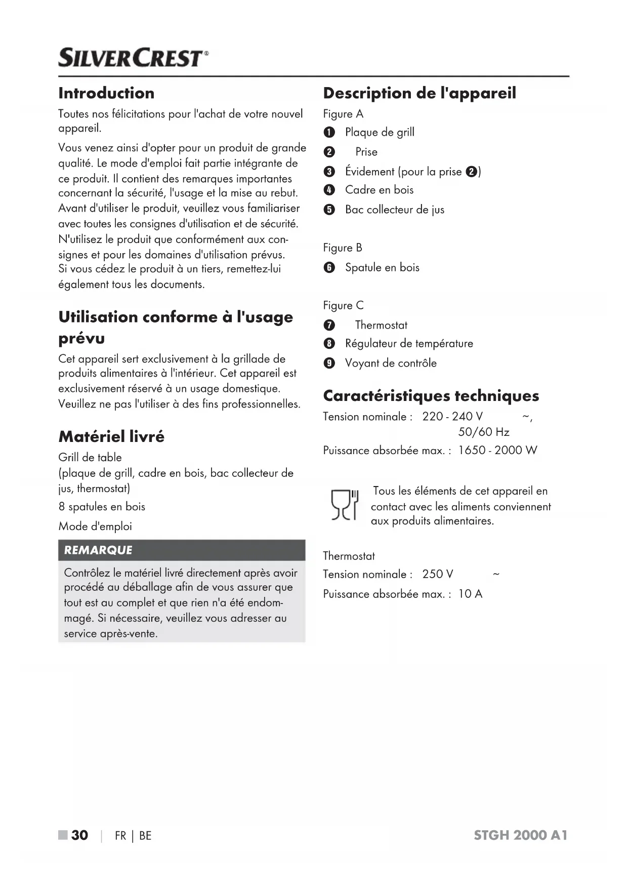 - Bruschetta ■ 30 │ FR│BE STGH 2000 A1 Introduction Toutes nos félicitations pour l'achat de votre nouvel appareil. Vous venez ainsi d'opter pour un produit de grande qualité. Le mode d'emploi fait partie intégrante de ce produit. Il contient des remarques importantes concernant la sécurité, l'usage et la mise au rebut. Avant d'utiliser le produit, veuillez vous familiariser avec toutes les consignes d'utilisation et de sécurité. N'utilisez le produit que conformément aux con- signes et pour les domaines d'utilisation prévus. Si vous cédez le produit à un tiers, remettez-lui également tous les documents. Utilisation conforme à l'usage prévu Cet appareil sert exclusivement à la grillade de produits alimentaires à l'intérieur. Cet appareil est exclusivement réservé à un usage domestique. Veuillez ne pas l'utiliser à des fins professionnelles. Matériel livré Grill de table (plaque de grill, cadre en bois, bac collecteur de jus, thermostat) 8 spatules en bois Mode d'emploi REMARQUE Contrôlez le matériel livré directement après avoir procédé au déballage afin de vous assurer que tout est au complet et que rien n'a été endom- magé. Si nécessaire, veuillez vous adresser au service après-vente. Description de l'appareil Figure A Plaque de grill Prise Évidement (pour la prise ) Cadre en bois Bac collecteur de jus Figure B Spatule en bois Figure C Thermostat Régulateur de température Voyant de contrôle Caractéristiques techniques Tension nominale: 220 - 240 V p. 42