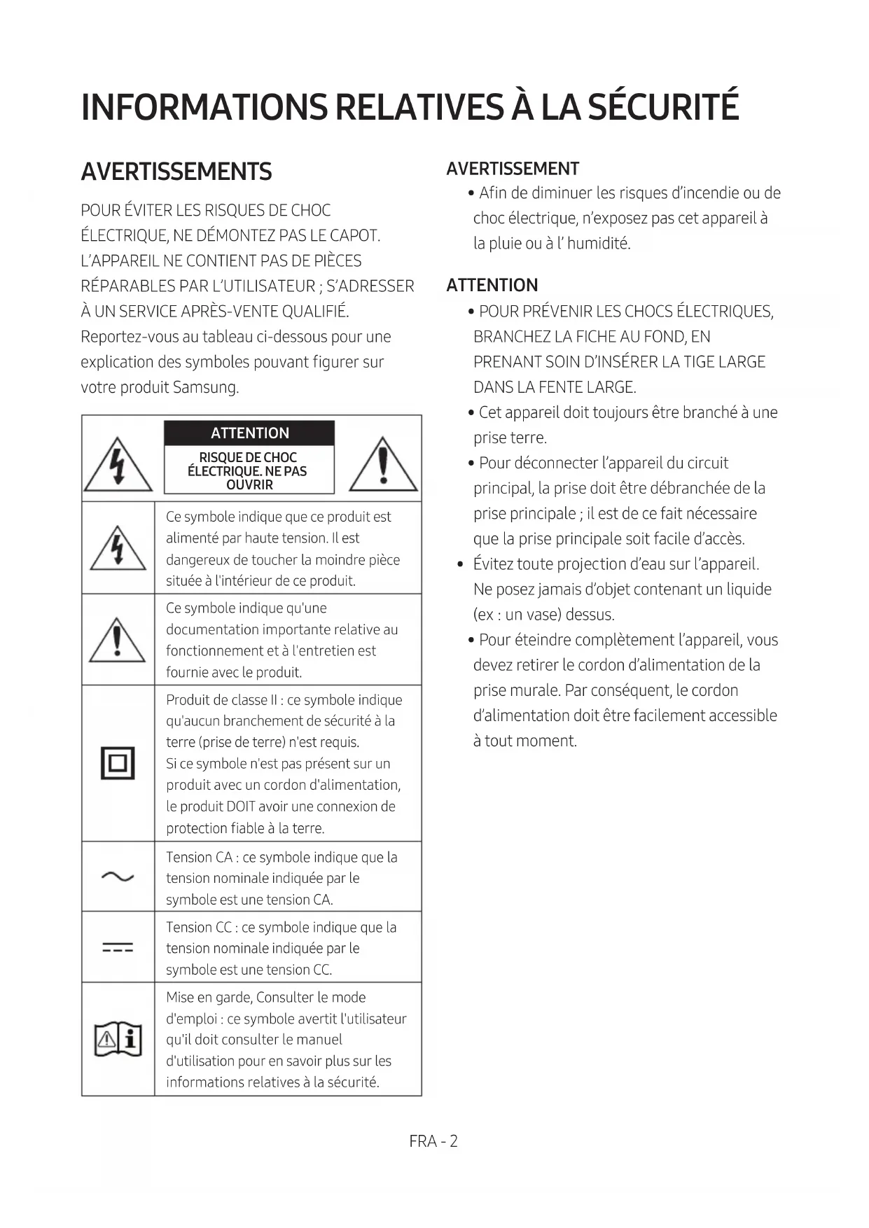 ÉLECTRIQUE, NE DÉMONTEZ PAS LE CAPOT. L’APPAREIL NE CONTIENT PAS DE PIÈCES RÉPARABLES PAR L’UTILISATEUR ; S’ADRESSER À UN SERVICE APRÈS-VENTE QUALIFIÉ. Reportez-vous au tableau ci-dessous pour une explication des symboles pouvant gurer sur votre produit Samsung. ATTENTION RISQUE DE CHOC ÉLECTRIQUE. NE PAS OUVRIRCe symbole indique que ce produit est alimenté par haute tension. Il est dangereux de toucher la moindre pièce située à l'intérieur de ce produit.Ce symbole indique qu'une documentation importante relative au fonctionnement et à l'entretien est fournie avec le produit.Produit de classeII: ce symbole indique qu'aucun branchement de sécurité à la terre (prise de terre) n'est requis. Si ce symbole n'est pas présent sur un produit avec un cordon d'alimentation, le produit DOIT avoir une connexion de protection able à la terre.Tension CA: ce symbole indique que la tension nominale indiquée par le symbole est une tension CA.Tension CC: ce symbole indique que la tension nominale indiquée par le symbole est une tension CC.Mise en garde, Consulter le mode d'emploi: ce symbole avertit l'utilisateur qu'il doit consulter le manuel d'utilisation pour en savoir plus sur les informations relatives à la sécurité. AVERTISSEMENT