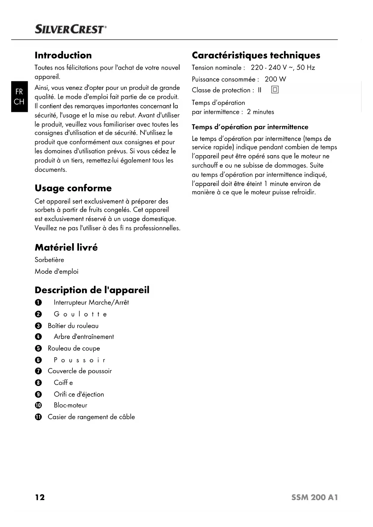 Introduction Toutes nos félicitations pour l'achat de votre nouvel appareil. Ainsi, vous venez d'opter pour un produit de grande qualité. Le mode d'emploi fait partie de ce produit. Il contient des remarques importantes concernant la sécurité, l'usage et la mise au rebut. Avant d'utiliser le produit, veuillez vous familiariser avec toutes les consignes d'utilisation et de sécurité. N'utilisez le produit que conformément aux consignes et pour les domaines d'utilisation prévus. Si vous cédez le produit à un tiers, remettez-lui également tous les documents. Usage conforme Cet appareil sert exclusivement à préparer des sorbets à partir de fruits congelés. Cet appareil est exclusivement réservé à un usage domestique. Veuillez ne pas l'utiliser à des fi ns professionnelles. Matériel livré Sorbetière Mode d'emploi Description de l'appareil 1 Interrupteur Marche/Arrêt 2 Goulotte 3 Boîtier du rouleau 4 Arbre d'entraînement 5 Rouleau de coupe 6 Poussoir 7 Couvercle de poussoir 8 Coiff e 9 Orifi ce d'éjection 0 Bloc-moteur q Casier de rangement de câble Caractéristiques techniques Tension nominale: 220 - 240 V ∼, 50 Hz Puissance consommée: 200 W Classe de protection: II Temps d’opération par intermittence : 2 minutes Temps d’opération par intermittence Le temps d’opération par intermittence (temps de service rapide) indique pendant combien de temps l’appareil peut être opéré sans que le moteur ne surchauff e ou ne subisse de dommages. Suite au temps d’opération par intermittence indiqué, l’appareil doit être éteint 1 minute environ de manière à ce que le moteur puisse refroidir.13 SSM 200 A1