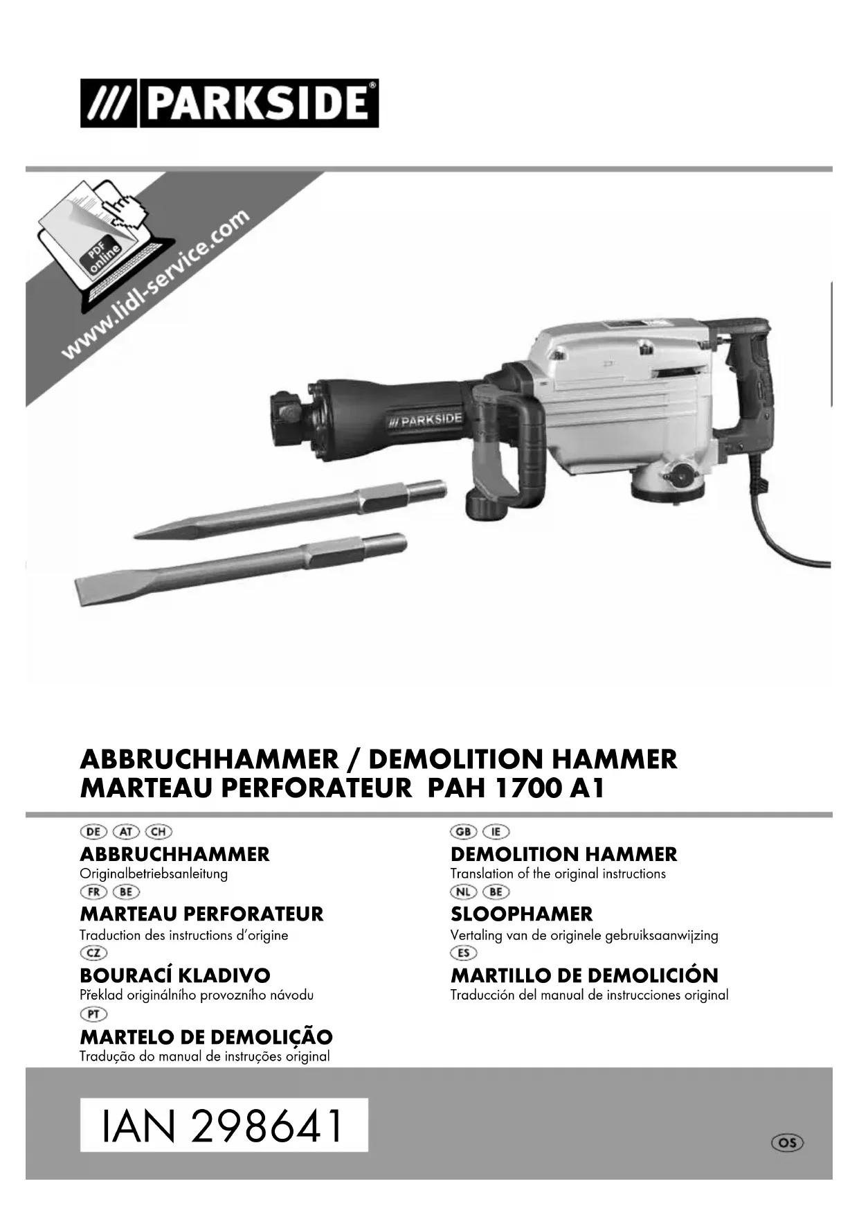 PAH1700A1 Introduction Nous vous félicitons pour l'achat de votre nouvel appareil. Vous venez ainsi d'opter pour un produit de grande qualité. Le mode d'emploi fait partie de ce produit. Il contient des remarques importantes concernant la sécurité, l'usage et la mise au rebut. Avant d'utiliser le produit, veuillez vous familiariser avec toutes les consignes d'utilisation et de sécurité. N'utilisez le produit que conformément aux con- signes et pour les domaines d'utilisation prévus. Si vous cédez le produit à un tiers, remettez-lui également tous les documents. Utilisation conforme à l'usage prévu Le marteau de démolition convient au burinage dans le béton, la pierre et le crépi. Toute utilisation autre ou modification de l'appareil est considérée comme non conforme et s'accom- pagne de risques d'accident non négligeables. Le fabricant n'assume aucune responsabilité pour les dommages résultant d'une utilisation non conforme à l'usage prévu. L'outil n'est pas conçu pour un usage professionnel. Composants représentés Figure A: Interrupteur de blocage Interrupteur MARCHE/ARRÊT Hublot de contrôle de l'huile Poignée supplémentaire Écrou moleté pour poignée supplémentaire Porte-outil Boulon de verrouillage Figure B: Balais de charbon Mallette de transport (à roulettes) Clé de montage Clé Allen Flacon d'huile Burin pointu Burin plat Graisse Matériel livré 1 marteau de démolition PAH 1700 A1 1 poignée supplémentaire 1 burin plat 1 burin pointu 1 mallette de transport (à roulettes) 1 jeu de balais de charbon 50 g de graisse 1 flacon d’huile 1 clé de montage 1 clé Allen 5 mm 1 clé Allen 6 mm 1 mode d'emploi Caractéristiques techniques Puissance nominale: 1700 W Tension nominale: 230 V ∼ 50 Hz (courant alternatif) Fréquence de frappe: 1900 min
