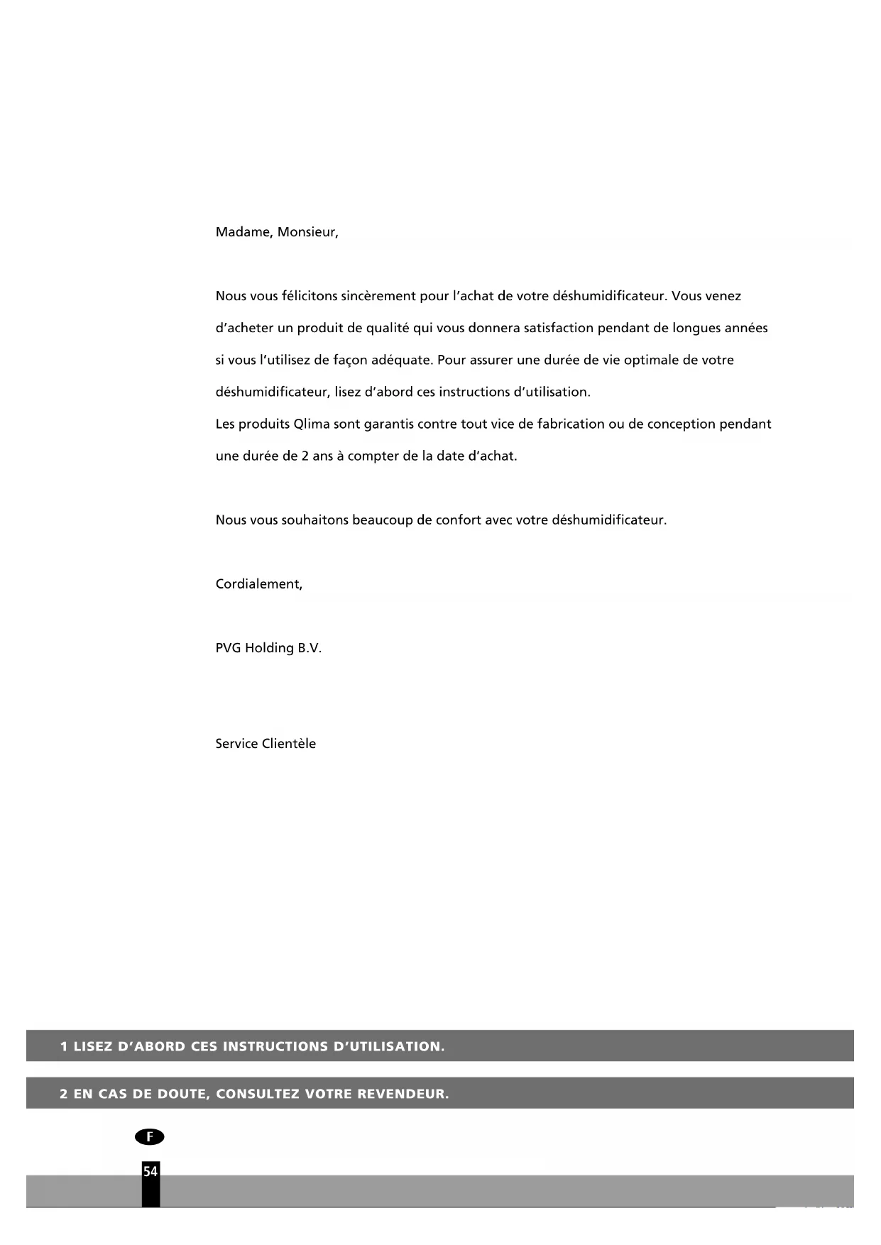 Madame, Monsieur, Nous vous félicitons sincèrement pour l’achat de votre déshumidificateur. Vous venez d’acheter un produit de qualité qui vous donnera satisfaction pendant de longues années si vous l’utilisez de façon adéquate. Pour assurer une durée de vie optimale de votre déshumidificateur, lisez d’abord ces instructions d’utilisation. Les produits Qlima sont garantis contre tout vice de fabrication ou de conception pendant une durée de 2 ans à compter de la date d’achat. Nous vous souhaitons beaucoup de confort avec votre déshumidificateur. Cordialement, PVG Holding B.V. Service Clientèle1 LISEZ D’ABORD CES INSTRUCTIONS D’UTILISATION. 2 EN CAS DE DOUTE, CONSULTEZ VOTRE REVENDEUR. PIÈCES PRINCIPALES Coque avant Prise de courant Poignée Panneau de commande Boîtier filtre Coque arrière Réservoir Pieds en caoutchouc Câble d’alimentation