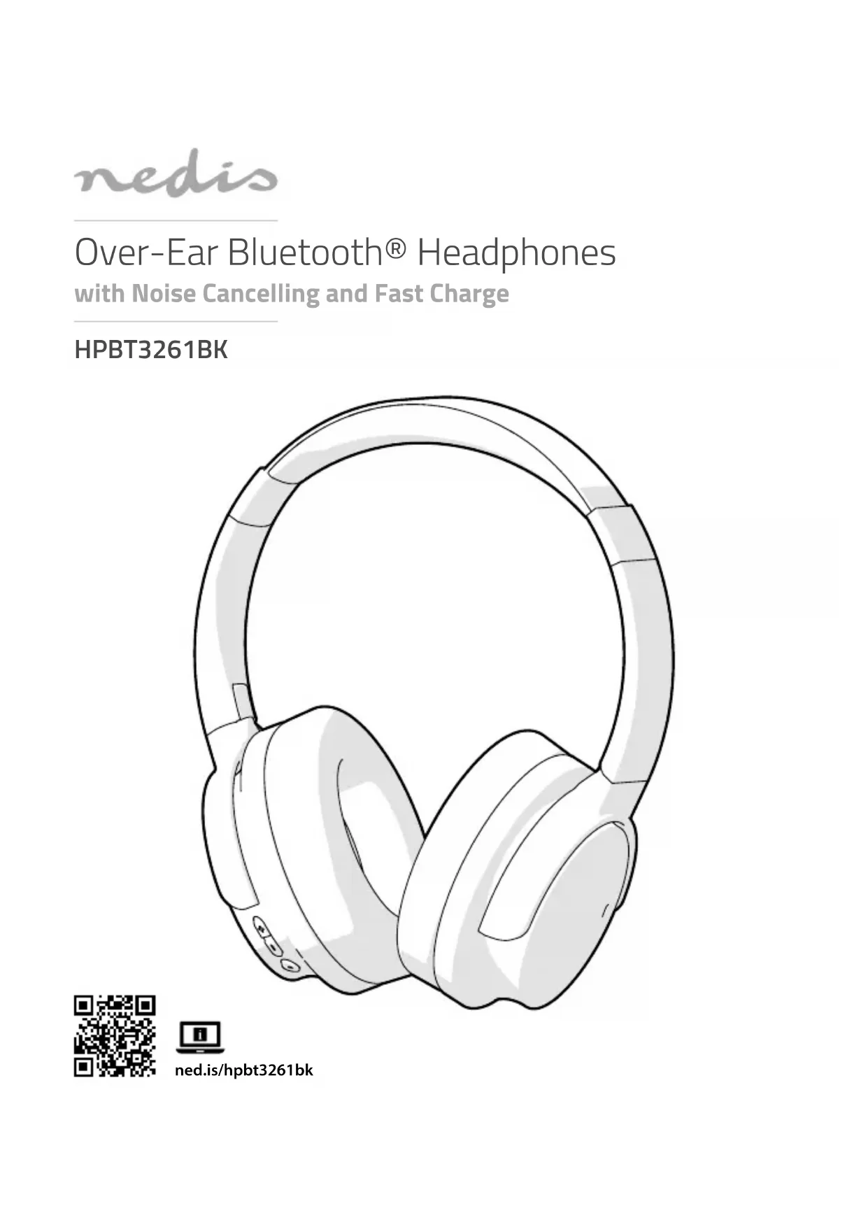 Guide de démarrage rapide Casque Bluetooth supra-auriculaire HPBT3261BK Pour plus d'informations, consultez le manuel détaillé en ligne : ned.is/hpbt3261bk Utilisation prévue Le HPBT3261BK Nedis est un casque Bluetooth avec suppression du bruit.Le produit est idéal pour les voyages et peut être rangé dans l'étui de voyage inclus.Toute modication du produit peut avoir des conséquences sur la sécurité, la garantie et le bon fonctionnement. Spécications Produit Casque Bluetooth supra-auriculaireArticle numéro HPBT3261BKGamme de fréquences 2402 - 2480 MHzVersion Bluetooth® 5.0Puissance de transmission maximale4 dBmCapacité de la batterie Batterie au lithium 3,7V / 650 mAh intégréePuissance d’entrée de charge5 VDC ; 1 A9