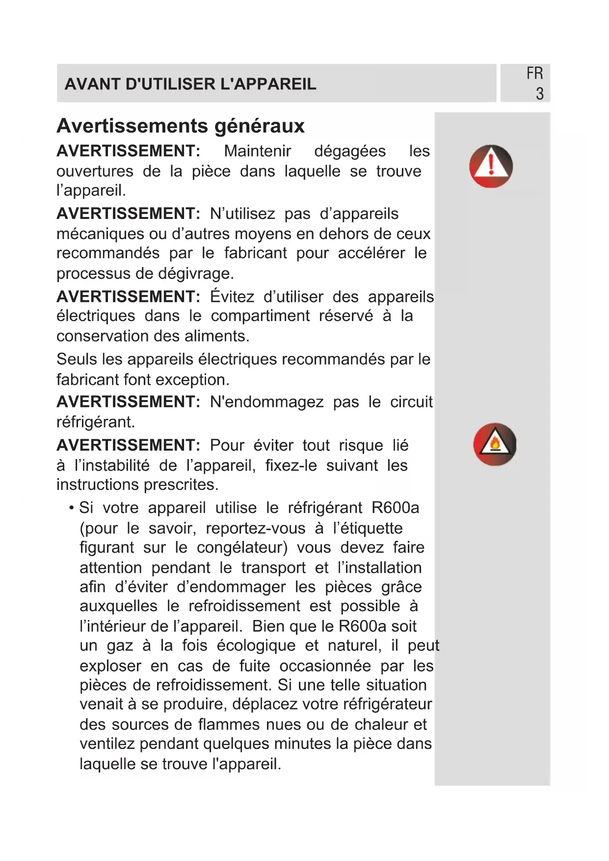 - Si votre appareil utilise le réfrigérant R600a (pour le savoir, reportez-vous à l’étiquette gurant sur le congélateur) vous devez faire attention pendant le transport et l’installation an d’éviter d’endommager les pièces grâce auxquelles le refroidissement est possible à l’intérieur de l’appareil. Bien que le R600a soit un gaz à la fois écologique et naturel, il peut exploser en cas de fuite occasionnée par les pièces de refroidissement. Si une telle situation venait à se produire, déplacez votre réfrigérateur des sources de ammes nues ou de chaleur et ventilez pendant quelques minutes la pièce dans laquelle se trouve l'appareil.