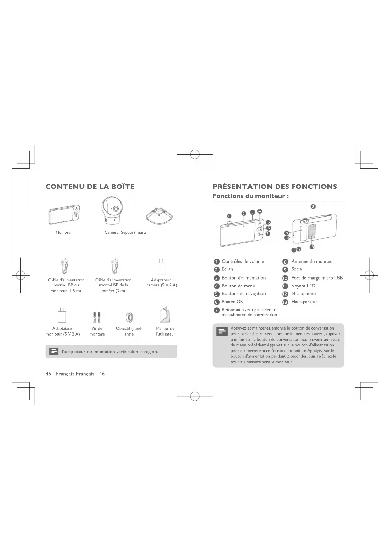 MoniteurCâble d'alimentation micro-USB du moniteur (1,5 m)Adaptateur moniteur (5 V 2 A)Vis de montageManuel de l'utilisateurObjectif grand-angleCâble d'alimentation micro-USB de la caméra (3 m)Adaptateur caméra (5 V 2 A)Caméra Support mural l'adaptateur d'alimentation varie selon la région.