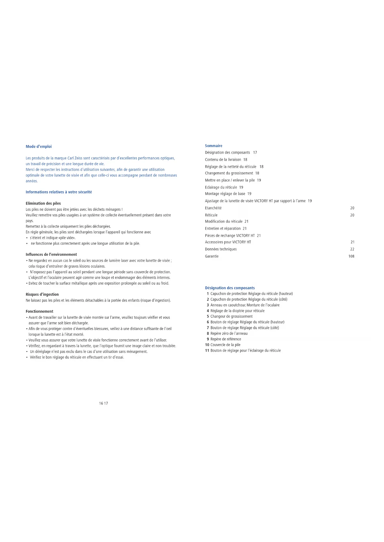 - Accessory not included in the delivery program!14 15 Notes Technical data VICTORY HT VICTORY HT VICTORY HT VICTORY HT 1.1-4x24 1.5-6x42 2.5-10x50 3-12x56 Magnification 1.1x 4x 1.5x 6x 2.5x 10x 3x 12x Field of vision (m / 100m) 38 10.5 24.8 6.9 14.8 4.1 12.5 3.5 Exit pupil (mm) 14.8 6.0 15.0 7.0 15.0 5.0 14.9 4.7 Dioptre adjustment range (dpt) -4 / +2 -4 / +2 -4 / +2 -4 / +2 Eye relief (mm) 90 90 90 90 Parallax-free (m) 100 100 100 100 Square adjustment range m/100m 3.0 2.3 1.4 1.2 Adjustment per click cm/100m 1 1 1 1 Centre tube diameter (mm) 30 30 30 30 Eyepiece tube diameter (mm) 42 42 42 42 Lens tube diameter (mm) 30 48 56 62 Length (mm) 289 331 321 347 Weight without track (g) 440 513 525 573 Weight with track (g) 465 538 550 598 Subject to changes in design and scope of supply due to technical improvements.16 17 Mode d’emploi Les produits de la marque Carl Zeiss sont caractérisés par d’excellentes performances optiques, un travail de précision et une longue durée de vie. Merci de respecter les instructions d’utilisation suivantes, afin de garantir une utilisation optimale de votre lunette de visée et afin que celle-ci vous accompagne pendant de nombreuses années. Informations relatives à votre sécurité Elimination des piles Les piles ne doivent pas être jetées avec les déchets ménagers ! Veuillez remettre vos piles usagées à un système de collecte éventuellement présent dans votre pays. Remettez à la collecte uniquement les piles déchargées. En règle générale, les piles sont déchargées lorsque l’appareil qui fonctionne avec s’éteint et indique «pile vide». ne fonctionne plus correctement après une longue utilisation de la pile. Influences de l’environnement Ne regardez en aucun cas le soleil ou les sources de lumière laser avec votre lunette de visée ; cela risque d’entraîner de graves lésions oculaires. N’exposez pas l’appareil au soleil pendant une longue période sans couvercle de protection. L’objectif et l’oculaire peuvent agir comme une loupe et endommager des éléments internes. Evitez de toucher la surface métallique après une exposition prolongée au soleil ou au froid. Risques d’ingestion Ne laissez pas les piles et les éléments détachables à la portée des enfants (risque d’ingestion). Fonctionnement Avant de travailler sur la lunette de visée montée sur l’arme, veuillez toujours vérifier et vous assurer que l’arme soit bien déchargée. Afin de vous protéger contre d’éventuelles blessures, veillez à une distance suffisante de l’oeil lorsque la lunette est à l’état monté. Veuillez vous assurer que votre lunette de visée fonctionne correctement avant de l’utiliser. Vérifiez, en regardant à travers la lunette, que l’optique fournit une image claire et non troublée. Un déréglage n’est pas exclu dans le cas d’une utilisation sans ménagement. Vérifiez le bon réglage du réticule en effectuant un tir d’essai. Sommaire Désignation des composants 17 Contenu de la livraison 18 Réglage de la netteté du réticule 18 Changement du grossissement 18 Mettre en place / enlever la pile 19 Eclairage du réticule 19 Montage réglage de base 19 Ajustage de la lunette de visée VICTORY HT par rapport à l’arme 19 Etanchéité 20 Réticule 20 Modification du réticule 21 Entretien et réparation 21 Pièces de rechange VICTORY HT 21 Accessoires pour VICTORY HT 21 Données techniques 22 Garantie 108 Désignation des composants 1 Capuchon de protection Réglage du réticule (hauteur) 2 Capuchon de protection Réglage du réticule (côté) 3 Anneau en caoutchouc Monture de l’oculaire 4 Réglage de la dioptrie pour réticule 5 Changeur de grossissement 6 Bouton de réglage Réglage du réticule (hauteur) 7 Bouton de réglage Réglage du réticule (côté) 8 Repère zéro de l’anneau 9 Repère de référence 10 Couvercle de la pile 11 Bouton de réglage pour l’éclairage du réticule18 19 Contenu de la livraison Lunettes de visée VICTORY HT avec éclairage du réticule Produit Numéro de commande Contenu de la livraison VICTORY HT 1,1-4 x 24 M 522404 Lunette de visée Cache de protection Couvercle de pile Pile lithium 3V CR 2032 Couvercle d’élévation Chiffon de nettoyage optique Mode d’emploi Attestation de garantie Certificat de qualité VICTORY HT 1,1-4 x 24 522405 VICTORY HT 1,5-6 x 42 M 522414 VICTORY HT 1,5-6 x 42 522415 VICTORY HT 2,5-10 x 50 M 522424 VICTORY HT 2,5-10 x 50 522425 VICTORY HT 3-12 x 56 M 522434 VICTORY HT 3-12 x 56 522435 Réglage de la netteté du réticule La netteté du réticule se règle en tournant l’oculaire (4). Il est recommandé de réaliser ce réglage à un niveau de grossissement plus élevé. Le réticule conserve alors sa netteté sur toute la plage de grossissement. Veuillez noter qu’avec les lunettes de visée de la série VICTORY HT, il n’est pas possible de régler à la fois la netteté du réticule et celle de l’image en cas de grossissements importants et de distances à la cible inférieures à 100 m, étant donné que ces lunettes de visée sont réglées sur 100 m sans parallaxe. Si la distance à la cible est nettement inférieure à 100 m, nous vous recommandons d’utiliser un réglage de grossissement plus petit. Remarque : Un bourrelet en caoutchouc(3) est intégré à la monture de l’oculaire afin de vous protéger contre toute blessure. Changement de grossissement Vous pouvez régler de manière continue tous les grossissements entre le niveau de grossissement le plus faible et le plus élevé. Le changement de grossissement se fait en tournant le changeur (5) sur le porte-oculaire. Les niveaux de grossissement sont désignés par des chiffres et des repères. Remarque: pour une utilisation au crépuscule ou la nuit : Rotation sur la gauche jusqu’à la butée - Grossissement maximal. Rotation sur la droite jusqu’à la butée - Grossissement minimal. Lorsque l’ergot du changeur se trouve en haut, le grossisse