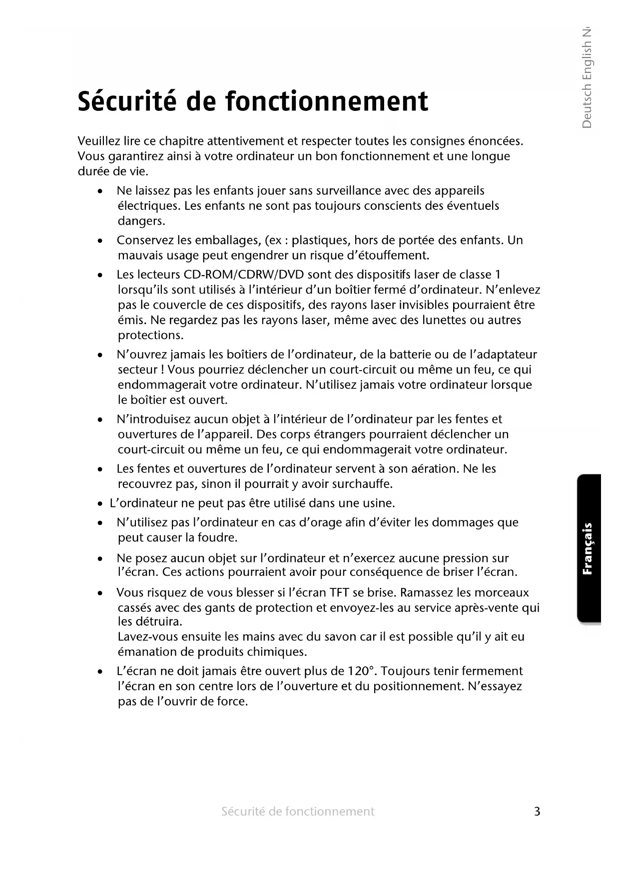 Deutsch English Nederlands Français Sécurité de fonctionnement Veuillez lire ce chapitre attentivement et respecter toutes les consignes énoncées. Vous garantirez ainsi à votre ordinateur un bon fonctionnement et une longue durée de vie. Ne laissez pas les enfants jouer sans surveillance avec des appareils électriques. Les enfants ne sont pas toujours conscients des éventuels dangers. Conservez les emballages, (ex : plastiques, hors de portée des enfants. Un mauvais usage peut engendrer un risque d’étouffement. Les lecteurs CD-ROM/CDRW/DVD sont des dispositifs laser de classe 1 lorsqu’ils sont utilisés à l’intérieur d’un boîtier fermé d’ordinateur. N’enlevez pas le couvercle de ces dispositifs, des rayons laser invisibles pourraient être émis. Ne regardez pas les rayons laser, même avec des lunettes ou autres protections. N’ouvrez jamais les boîtiers de l’ordinateur, de la batterie ou de l’adaptateur secteur ! Vous pourriez déclencher un court-circuit ou même un feu, ce qui endommagerait votre ordinateur. N’utilisez jamais votre ordinateur lorsque le boîtier est ouvert. N’introduisez aucun objet à l’intérieur de l’ordinateur par les fentes et ouvertures de l’appareil. Des corps étrangers pourraient déclencher un court-circuit ou même un feu, ce qui endommagerait votre ordinateur. Les fentes et ouvertures de l’ordinateur servent à son aération. Ne les recouvrez pas, sinon il pourrait y avoir surchauffe. L’ordinateur ne peut pas être utilisé dans une usine. N’utilisez pas l’ordinateur en cas d’orage afin d’éviter les dommages que peut causer la foudre. Ne posez aucun objet sur l’ordinateur et n’exercez aucune pression sur l’écran. Ces actions pourraient avoir pour conséquence de briser l’écran. Vous risquez de vous blesser si l’écran TFT se brise. Ramassez les morceaux cassés avec des gants de protection et envoyez-les au service après-vente qui les détruira. Lavez-vous ensuite les mains avec du savon car il est possible qu’il y ait eu émanation de produits chimiques. L’écran ne doit jamais être ouvert plus de 120°. Toujours tenir fermement l’écran en son centre lors de l’ouverture et du positionnement. N’essayez pas de l’ouvrir de force.Français