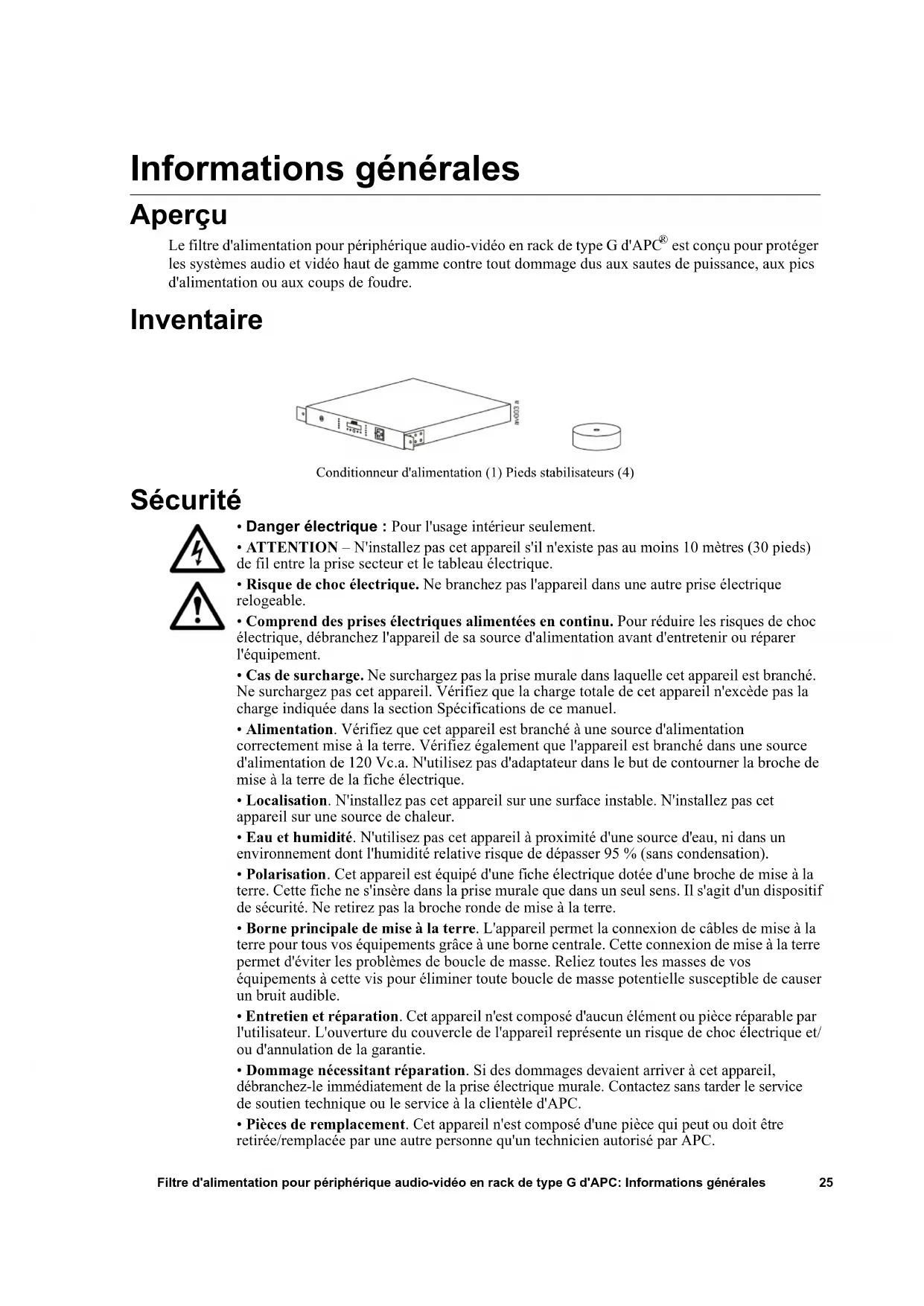 - Pièces de remplacement. Cet appareil n'est composé d'une pièce qui peut ou doit être retirée/remplacée par une autre personne qu'un technicien autorisé par APC. Conditionneur d'alimentation (1) Pieds stabilisateurs (4)Filtre d'alimentation pour périphérique audio-vidéo en rack de type G d'APC: Informations générales26 Composants Vue avant Vue arrière Disjoncteur Écran LCD Prise