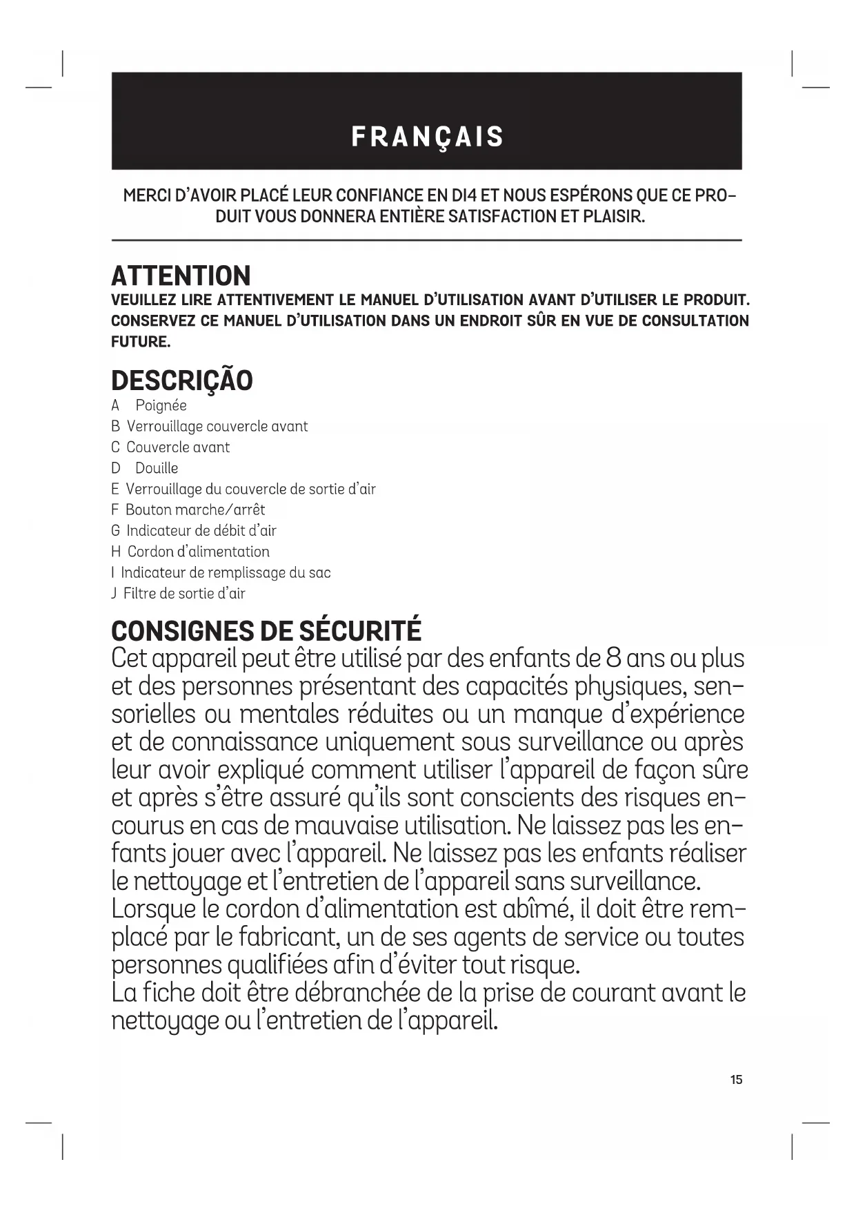 CCe produit est conforme à la Directive Européenne 2012/19/UE relative aux déchets d’équipements électriques et électroniques (DEEE) qui fournit le cadre légal applicable dans l’Union Européenne pour l’élimination et la réutilisation de déchets d’équipements électriques et électroniques. Ne jetez pas ce produit à la poubelle, rendez-vous au centre de collecte des déchets d’équipements électriques et électroniques le plus proche de chez vous.19 GRAZIE PER AVER RIPOSTO LA LORO FIDUCIA IN DI4 E LA SPERANZA CHE IL PRODOT- TO SODDISFI APPIENO LE VOSTRE ASPETTATIVE. AVVERTENZE PRIMA DI UTILIZZARE IL PRODOTTO, LEGGERE ATTENTAMENTE LE ISTRUZIONI D’USO. CON- SERVARE LE ISTRUZIONI IN LUOGO SICURO PER CONSULTAZIONI FUTURE. DESCRIZIONE A Impugnatura B Chiusura coperchio frontale C Coperchio frontale D Attacco di aspirazione E Pedale avvolgimento cavo F Interruttore a pedale On/Off G Indicatore di flusso d’aria H Cavo di alimentazione I Indicatore di pieno J Griglia uscita aria